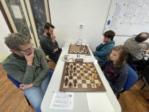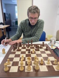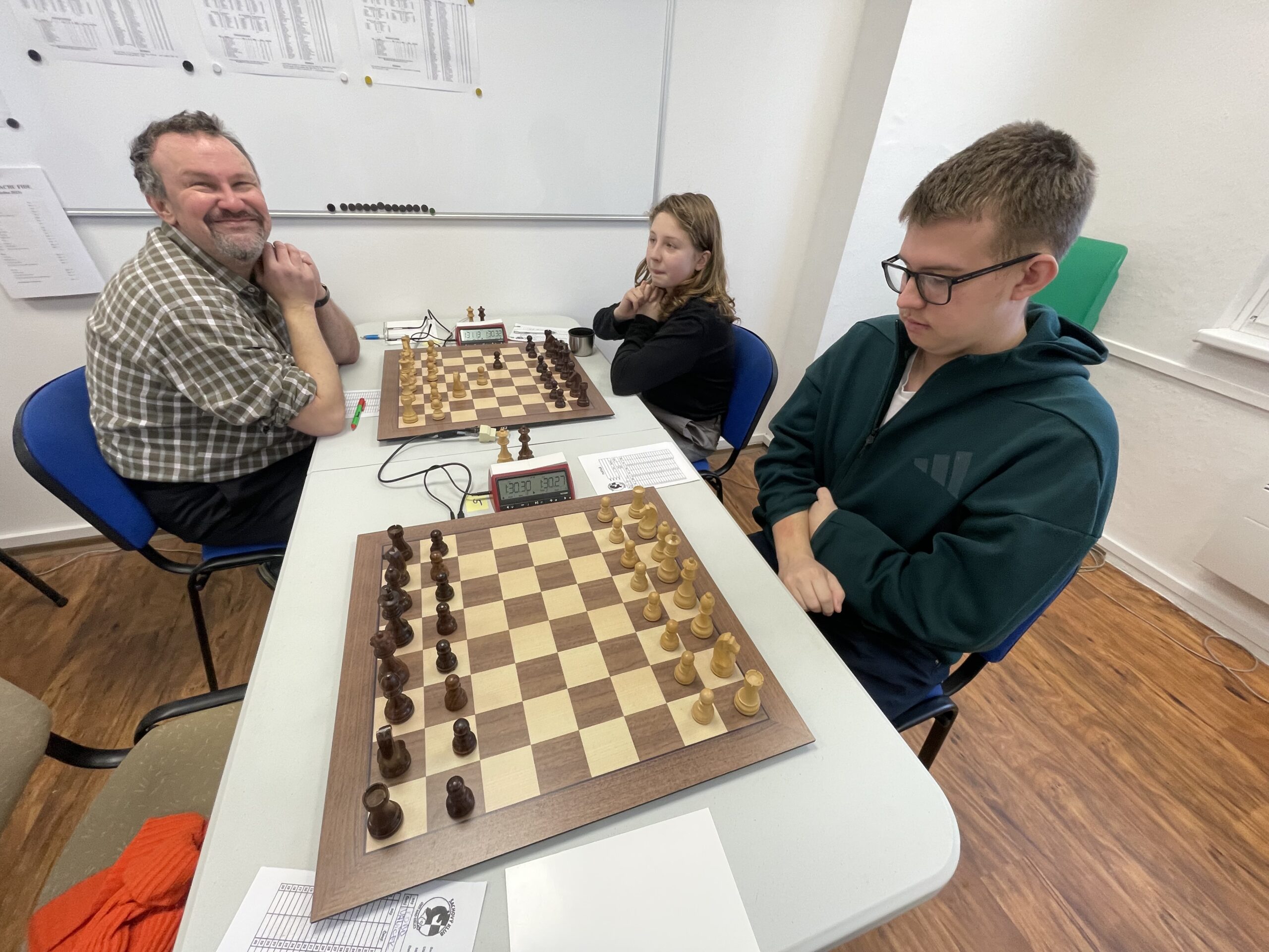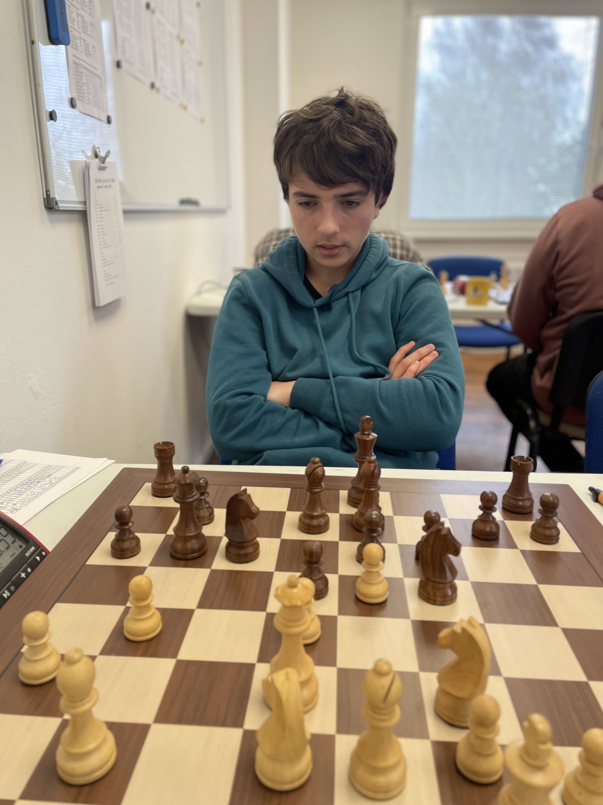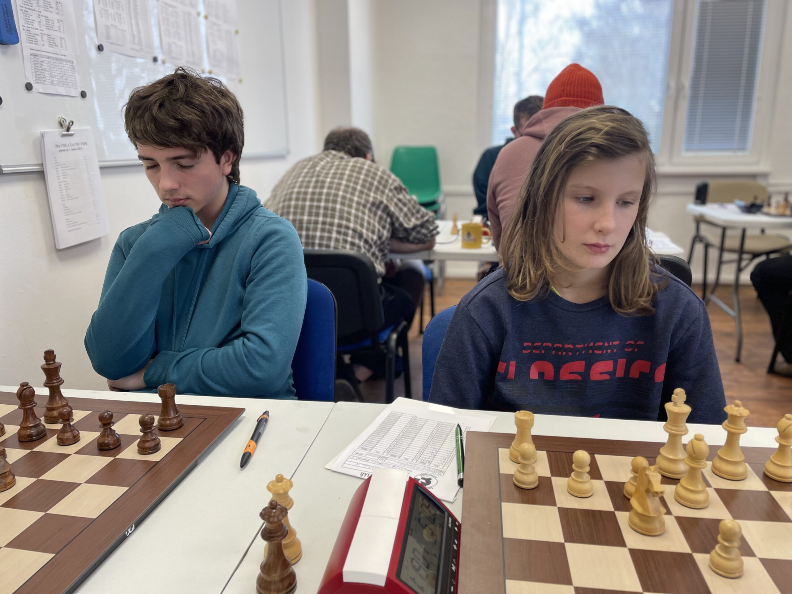 Přivítání, Martin Šmajzr nahodil onlajny a jdeme na věc! Zápas od gongu bojovný, první to zkusil zapůlit až Pavel Kylar před polednem, ale náš junior chtěl hrát. Na první desce nahradil rozpaky optimismus, můj soupeř dovedně vymýšlel. Na třetí určitě nejsme horší, na čtvrté hoříme míň než obvykle. Matěj pomalinku zesiluje, Marian hurá útok odráží a směřuje do vyhrané koncovky. Saša hraje oboustranně prapodivnou partii na aktivitu a Skubík v klidu postavil zavřenou Francii.