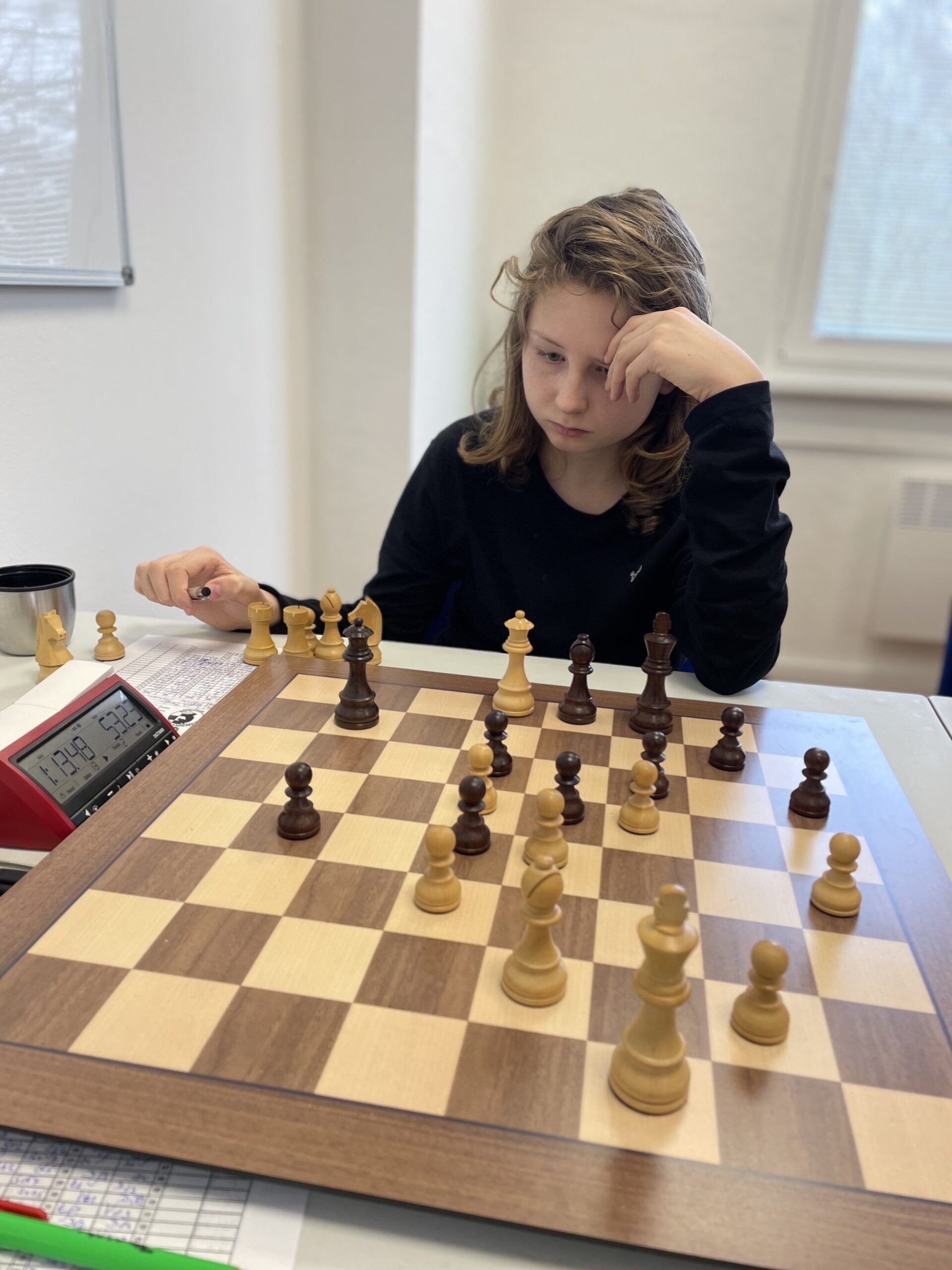 - Slanina – Skubi 1:0 Honzik je válec, 3/3 a pokaždé poctivé poziční výkony. Tady solidní zavřená francouzská, bílý nehrál zle, ale dost složitě vymýšlel. Náš junek učebnicově podkopal bílé centrum a pak našel moc hezký obrat na g3, po kterém soupeř hned zkolaboval – přehlédl figuru. Platí, co už jsem v minulých reportážích: Skubík je pro mě velmi příjemné překvapení a řekl si o další nominačku. V mládeži kdovíjaké výsledky nesbíral, ale pomalejší tempo a dospělí soupeři mu zjevně sedí, na partie se kouká hezky a gymnazista-kvartán má možnost velmi zajímavého progresu.