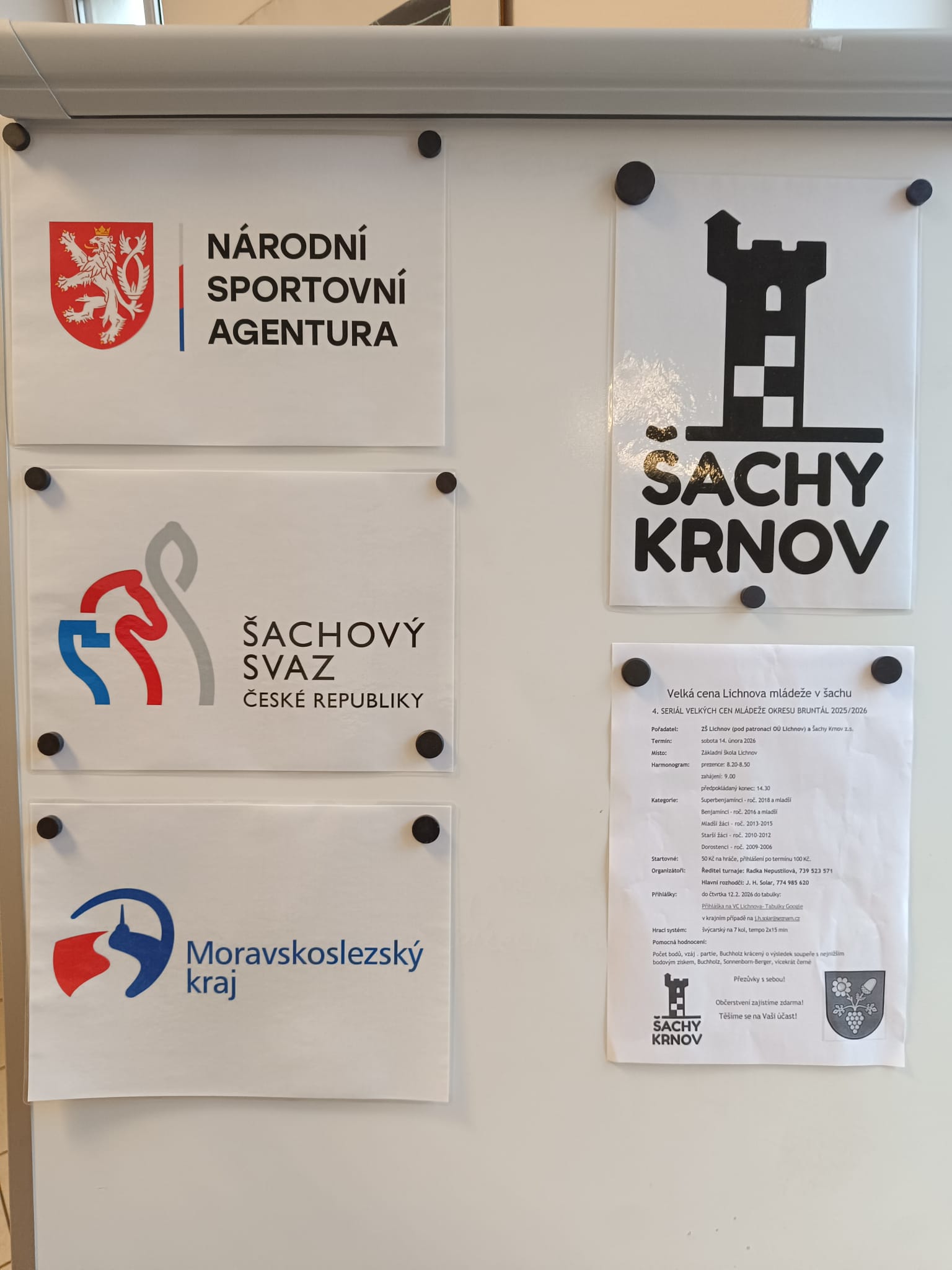 Po více jak týdenním naléhání našeho syna, kdy nebyl kroužek kvůli jarním prázdninám ani žádný tréninkový zápas v jeho kategorii, jsme s manželkou hledali nějakou šachovou aktivitu pro syna de facto po celé ČR. Díky Facebooku jsme našli ve 140 km vzdáleném Lichnově u Bruntálu Okresní velkou cenu mládeže v šachu. Že bychom to zkusili? Zvažovali jsme jak vzdálenost, tak jestli nás vůbec přijmou. Na startovní listině byli samí zástupci Krnova a Bruntálu. My jediní bychom byli přespolní, prostě z jiného kraje. V pozvánce však zvou i děti z jinych okresů nebo Polska. Do našeho už i tak těžkého rozhodování nám vstoupila ještě rýma, takže jsme nevěděli do poslední chvíle, jestli vůbec pojedeme.