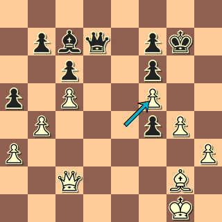 Tak to je kuriózní pozice, zase jsem ji při zápase podcenil! Na první pohled jsou tři spojení pěšci jasně lepší než izolovaný trojpěšec; na druhý pohled vynikne remízová tendence nestejnopolných střelců … a na třetí pohled ožívá černá dáma, padá pata bílého pěšcového řetězu na a3 (nebo na b4) a může se projevit síla nestejnopoláka v útoku na krále, do hry může vstoupit i volňák f4. Černý stojí lépe! 30. … Dd4+ 31. Kf1? Nešlo ani Kh1??, tam už jsou maty. Nutné bylo Df2. 31. … Da1+ 32. Ke2 Dxa3 33. bxa5? De3+ 34. Kd1? Dg1+ Původně jsem výhru považoval za dost náhodnou, i vzhledem k řečem v kuloárech, že to bílý přehnal a něco přehlédl. Zpětně se mi ale partie líbí čím dál víc. Pěkný poziční výkon! 0:1