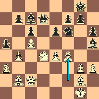 Trochu jako Martin Petráž v minulé partii. Prostorová převaha funguje jen za pěšcovou ohradou; jakmile se na kolbiště vřítí soupeř, znamená volný prostor příležitost k řádění jeho figur – pro obránce je to příliš mnoho polí k pokrytí. 23. Kg2?! (23. Df2) exf5?! (23. … Sh5! 24. Dxh5 Dxd2+ 25. Vf2 Dd5+) 24. Vad1?! Pěšce šlo dobrat: 24. Sxf5 Vxf5 25. Vxf5 Dxa1 26. Vxe5. Tah věží ale skrývá zajímavou léčku, do níž černý spadne. 24. … Jg4??