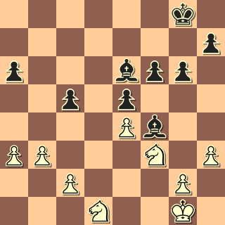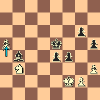 Zajímavá koncovka, v níž by dvojice střelců měla být silnější. Jezdci jsou z centra vytlačeni, ani na izoláky dámského křídla se nedostanou, naopak tam naleznou objekty útoku černí střelci. 1. … a5?! Asi chystá Sc1, ale to šlo zrovna (1. … Sc1 2. b4? Sxa3). 2. Jc3 Sc1 3. a4 c4! 4. Jd5?