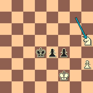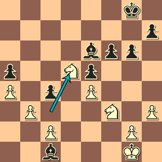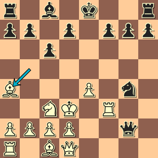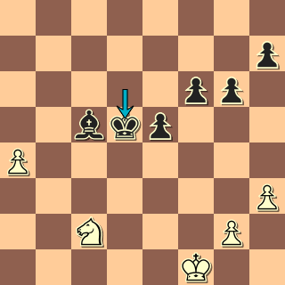 Do téhle pozice asi černý při braní jezdce směřoval. Převaha střelce nad jezdcem spočívá v tom, že dokáže být na obou křídlech najednou: na dámském postupu pěšce bránit, na královském vlastní pěšce podporovat. Převaha černého je tu taková, že si může klidně pro a pěšce dojít králem. Ani rozhodnutí nechat ho být a nastoupit pěšci královského křídla však není špatné. 13. Ke2 f5 14. Ja1 Sb4?! (Kc4!) 15. Kd3 Kc5 16. Jb3+ Kd5 Brnká soupeři opakováním tahů na nervy, protože ten zjišťuje, že stejně nic nemůže. 17. Ja1 e4+ 18. Ke3 Kc5?! Pořád se vyhýbá aktivizaci krále Kc4! 19. Jb3+ Kd5 (Kc4!) 20. Ja1 Ke5 I to je rozumný plán, musí si však být vědom toho, že a pěšce teď hlídá jen střelec. 21. Jb3 f4+ 22. Kf2?! Na bílý! Ke2! 22. … h5 23. a5