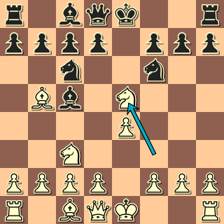 9. …Dg3!! Jediná možnost, jak pokračovat v útoku. Oběť figury za vyhnání krále do centra. 10. hxg4 Jxg4 11. Vf3 Dh2+ 12. Kf1 Dh1+ 13. Ke2 Dxg2+ 14. Kd3? Nechce opakovat tahy, ale černý útok je nebezpečný! 14. … c6! 15. Sa4