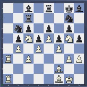 Já si v přípravě vzpomněl na letní partii z Olomouckého rapidu a tentokrát si připravil teoretičtější pokračování. Odbočku 11.De7 jsem ale neznal a reagoval jsem trochu moc při zdi. Přesto mi počítač přiznává pohodlnou výhodu. Přeci jen: bílé centrum je dominantní a černý musí spíš čekat. V pozici na diagramu jsem však zazmatkoval a ztratil koncepci.