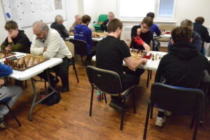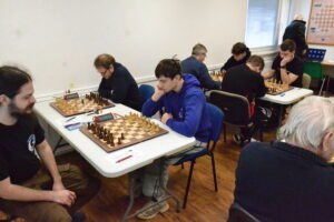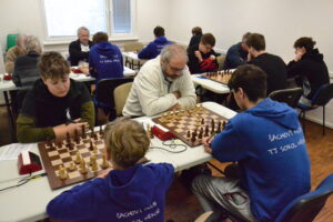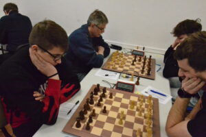 Bílými hrál obávaný soupeř našich juniorů (věkově jako Křížek, Růžička apod.). Vojta na něj vybalil Hrocha, bílý stál ze zahájení lépe, ale postupně ztratil iniciativu a spíš bránil. Vojta vyměnil jezdce za černopoláka, který chránil slabiny v táboře bílého, všechny figury dal na královské křídlo (dámu na háčko, věže na efko, aktivního koně) a prorazil obětí na g2. 0:1