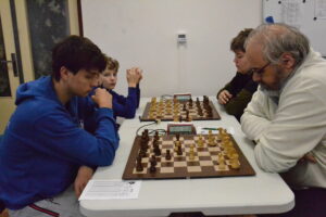 Ondra je mladší a menší, ale šachy hraje déle než Matyáš. Čtyřjezdcovka znamenala popotahování a občasné výměny, to jsou takové šachy bez fantazie. Celkem kolem rovnováhy, ale pak dal na prahu věžovky Matyáš pěšce a i další měl slabé. Snažil se ještě o protihru, ale doplatil na příliš odvážného krále, mat můžete dostat i v koncovce. Nicméně pro Matyáše další dlouhá partie se zápisem, je třeba vytrvat. 1:0