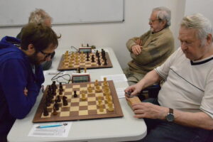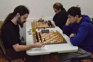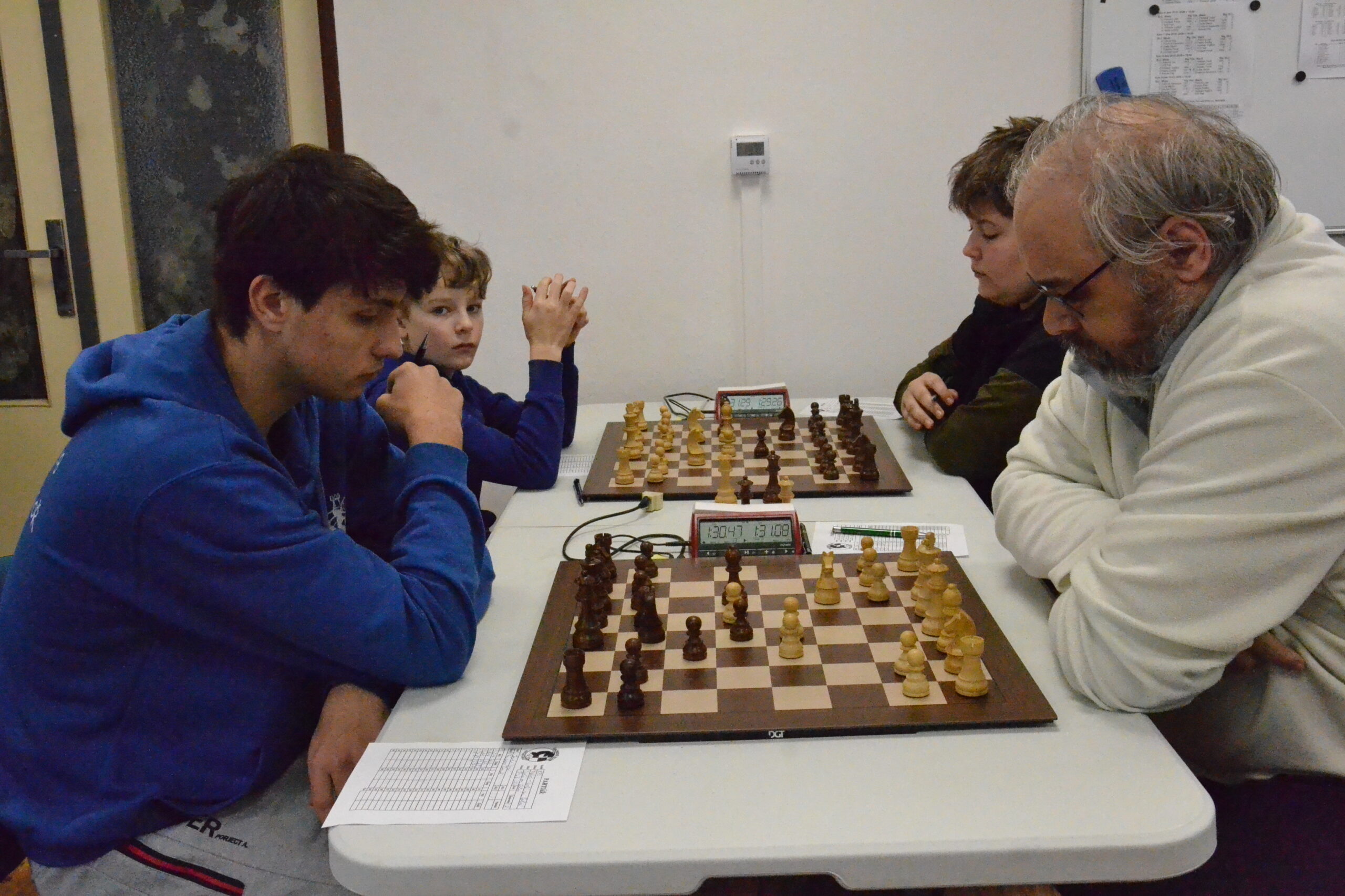 Mladší z Kníznerů, věkem ještě v žákovských kategoriích. Jirka hraje strašlivě zamotané šachy, kde si vytvoří náročné taktické úkoly, a ty pak nevyřeší. Tady to ze zahájení (zeď b4-c5-d4-e5, kterou černý boural), dopadlo ještě dobře, ale pak si včas nerochnul, poztrácel na dámském křídle pěšce a pokoušel se o protiútok na královském. V jednu chvíli tam byl i věčňák, ale když se dým nad bojištěm rozptýlil, chyběla věž a mat dostal bílý král. Na to, jak náročná partie to byla, ji hráči téměř odblicali. 0:1