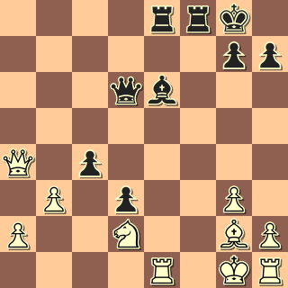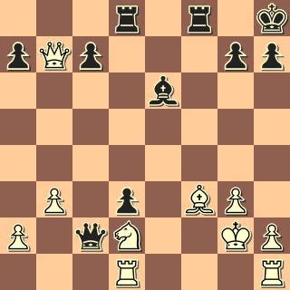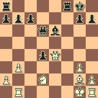 Kritická chvíle na odhad pozice: po partii jsem se soupeřem debatoval o tom, že mám sice jen jednoho pěšce za figuru, přičemž se jich dost již vyměnilo, ale ve skutečnosti musí být bílý velice ostražitý, protože rozdíl ve spolupráci a rozehranosti figur je markantní a černá pozice se mi zamlouvala (škoda jen, že Dd6 nepřišlo o 10 tahů dřív). Po 19. Ve1 Vae8 přišla ona neopatrnost, která měla být potrestána – 20. Dxb7?? správné bylo 20. Dd3 a po Kh8 21. Je4 volí černý mezi Sf5 a Db4, přičemž jeho útok pomalu skomírá, ale přece jenom by si bílý ještě musel zapřemýšlet při realizaci materiální výhody. Po 20. … d3! je najednou černý forsírovaně vyhraný, ač tomu bílý v popartiové analýze nechtěl věřit – sice jsem mu při analýze nedokázal najít přesné varianty, ale moje intiuce mě nezklamala (narozdíl od propočtu): Po ještě nejlepším 21. Dxa7!? následuje konec po 21. … c5 22. Da4 c4!