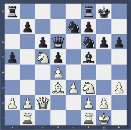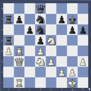 20. …, Sxd3 21. Jxd3, Jf5 22. b4! Konečně přišel čas do toho říznout. 22. …, Jd6 23. a4, De7 Černé figurky opět musí reagovat a preventivně se stahují k obraně dámského křídla. 24. bxa5 Velmi srozumitelné rozhodnutí. Pole b5 je navždy kryto jezdcem čili tudy neprojdu. Otevřením sloupce však uvolňuji dráhu až k slabé patě pěšcového řetězce na b7. Jednoduchý tah pěšcem a jakou má moc! 24. …, Vxa5 25. Vb4, Vea8 26. Vcb1, V8a7 27. Db3, Dd8 28. Jfe5. Kg7. Pozice je optimální. Kudy dál?