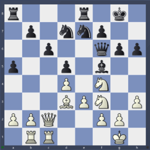 13. …, a5 To není dobrovolná expanze, ale typové zamezení postupu pb4. 14. Ja4, Sf5 15. Jc5 …aneb když nemáš jasný tah, vylepšuj figurky. Případné b6 bude bílé jedině svědčit, čím více se černí pěšci odkopou, tím budou slabší.