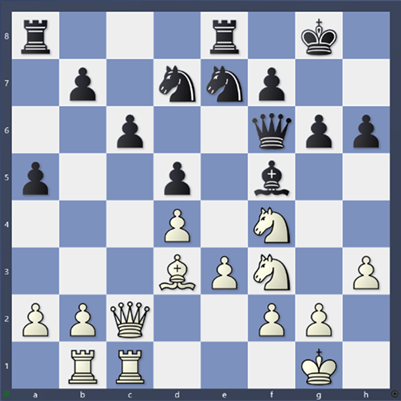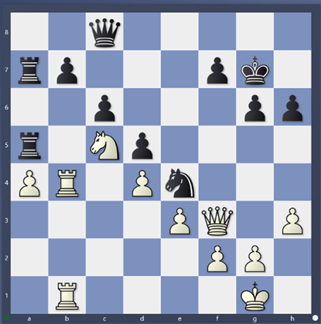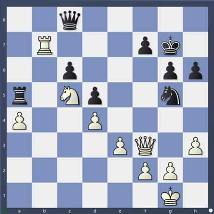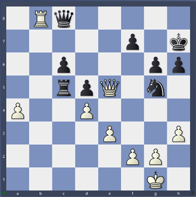 A co že tedy Divya přehlédla? Po 37. Dg3, Vxc5 38. De5, Kh7 39. Vb8 má černá dvě minuty na hodinách. Najdete vyrovnávající taktiku?