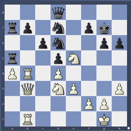 Vypadá to, že černá pozici zachrání. Hrozí 37. …, Vxc5 38. dxc5, Dxb7. Divya však našla krásnou výmluvu: 37. Dg3, Vxc5 38. De5, Kh7 39. Vb8. Visí dáma a hrozí mat na h8. Jenže černá má také výmluvu.