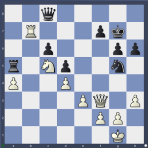 Vítězná taktika proto spočívala v něčem trochu jiném. 37. Dg4! Pokud černá dáma uhne, přichází h4 s následným Je6 a černý král nemůže přežít! Černá tedy musí brát. 37. …, Dxg4 38. hxg4. A bílé do koncovky zůstává pěšec navíc: volný kraják, kterého se lze zbavit jen za cenu ztráty centra. Pěšce c6+d5 si přitom bílý dobere tak jako tak, jelikož černé figury zkrátka nejsou sehrané.