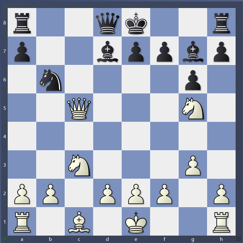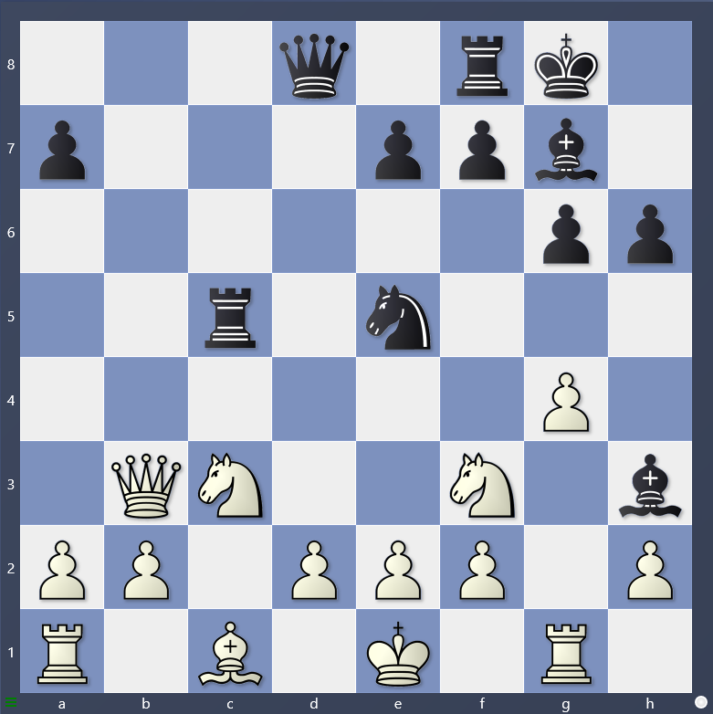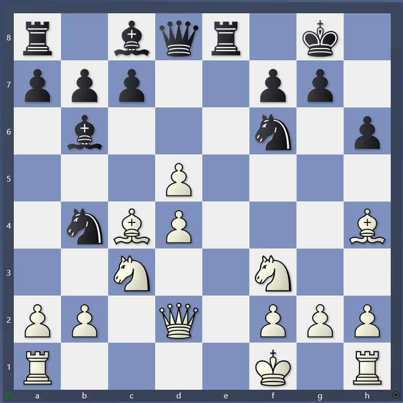 Za cenu dámského křídla si teď Wei Yi začne diktovat podmínky. 11. …, h6 12. Jf3, Vc8 13. Da5, Sh3 A je po rošádě! 14. Db5, Jd7 15. Vg1 Co mu jiného taky zbývá… Připustit Sg2 by mohlo být fatální. 15. …, 0-0 16. g4 Hrozba Vg3 je zřejmá. Paradoxně tak bílý bez rošády a bez vývinu začíná stát o fous lépe. 16. …, Vc5 Proč by ne. Motoru se to nelíbí, ale neuvádí žádný zjevný důvod. Bílý zkrátka má velmi logické pole pro dámu. Tak možná proto? 17. Db3, Je5??