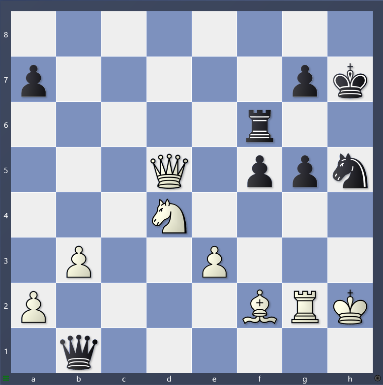 42. …, Jf4! 43. exf4, Vh6! 44. Kg3, Dd3! 45. Df3, g4! No, to je kombinace! Bílá tady vynuceně ztrácí materiál. Rozhodla se ještě zkusit koncovku J+S x D, ale černá dáma je příliš silná. 0-1