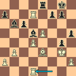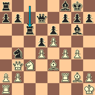 Věž jde pod úder bílého střelce. To jsem viděl, nějak mě ale nenapadalo nic lepšího. Proti a7-a5 jsem měl nějaký podvědomý blok, škoda. 21. f5 exf5 22. Jxd5?! Přirozenější 22. gxf5 Sxf5 23. a3 Ja6 24. Dxd5 (nebo Sxd5) by černá pozice asi nevydržela. Naopak teď získám slušné šance obětí kvality. 22. … Jxd5 23. Dxd5 Dxd5 24. Sxd5 fxg4! To je ona. 25. Sxc6 bxc6 26. Vf4 Naštěstí bílý převodu střelce na hlavní diagonálu natrvalo nezabrání. 26. … h5 27. Vc1 Se7! 28. Vc3 Sg5 29. Vf1 Se4+