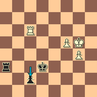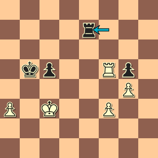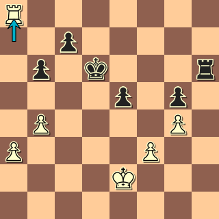 Věžovka pravděpodobně remízová; černý má izoláky e5 a g5, ale může nalézt dostatečnou protihru (např. když půjde bílá věž pro pg5, dojde si černá pro pa3). Bílý měl ještě dvě minuty, černý už jen půlminutu (bonifikace 5s). Tady už zejména černý nemůže stíhat přesný propočet a musí se tedy řídit všeobecnými zásadami. 1. … Vg6? A jednou z nich je aktivita figur v koncovce. Co je lepší: udělat z věže pasívního obránce pg5 nebo aktivního škůdce v týlu nepřítele? (1. … Vh2+!) 2. Kd3 Vg7 3. Ke4 c6? Zbytečně oslabuje pěšce. 4. Vd8+ Kc7 Po 4. … Ke7 5. Vb8 černý nesmí připustit výměnu věží, pěšcovku by prohrál, musí tedy dát pb6, kterého tahem c6 oslabil. 5. Ve8 c5 Černý tedy už ztrácí pěšce a opožděně zahajuje protihru. 6. bxc5 bxc5 7. Vxe5 Kb6 8. Kd3 Možná zbytečně „na jistotu“. 8. … Kb5 9. Kc3 Vf7 10. Vf5 Ve7!?