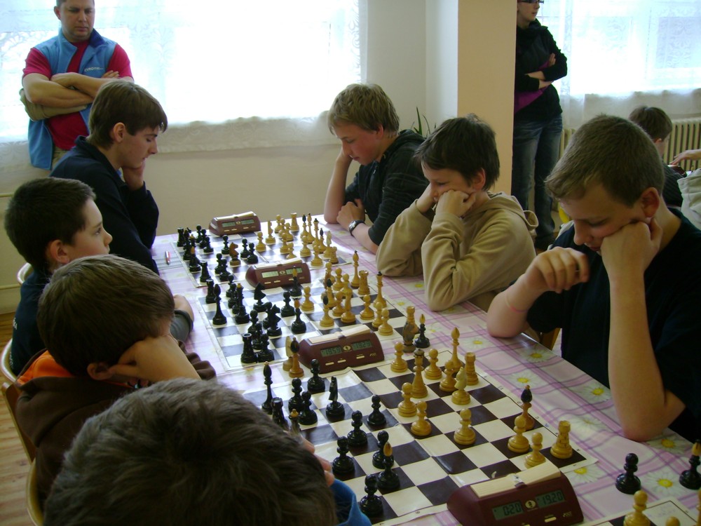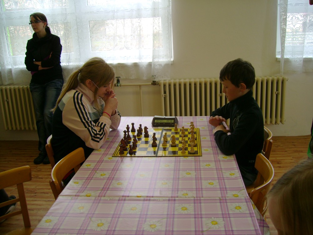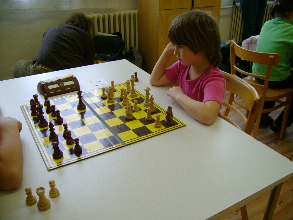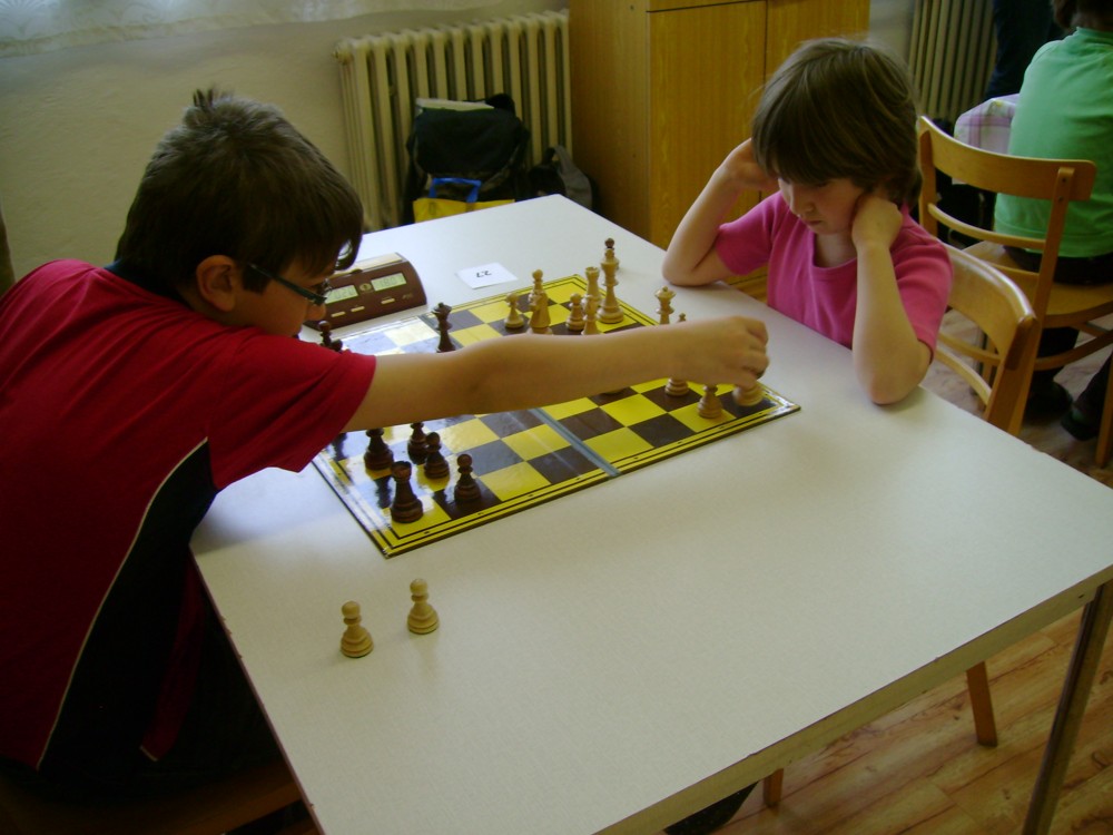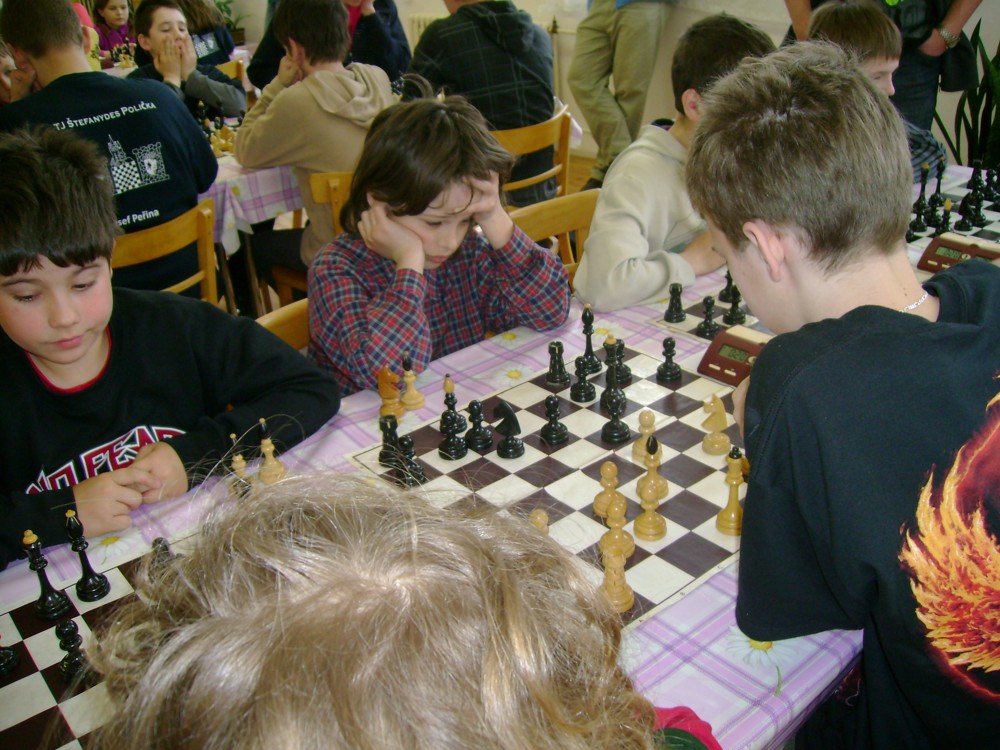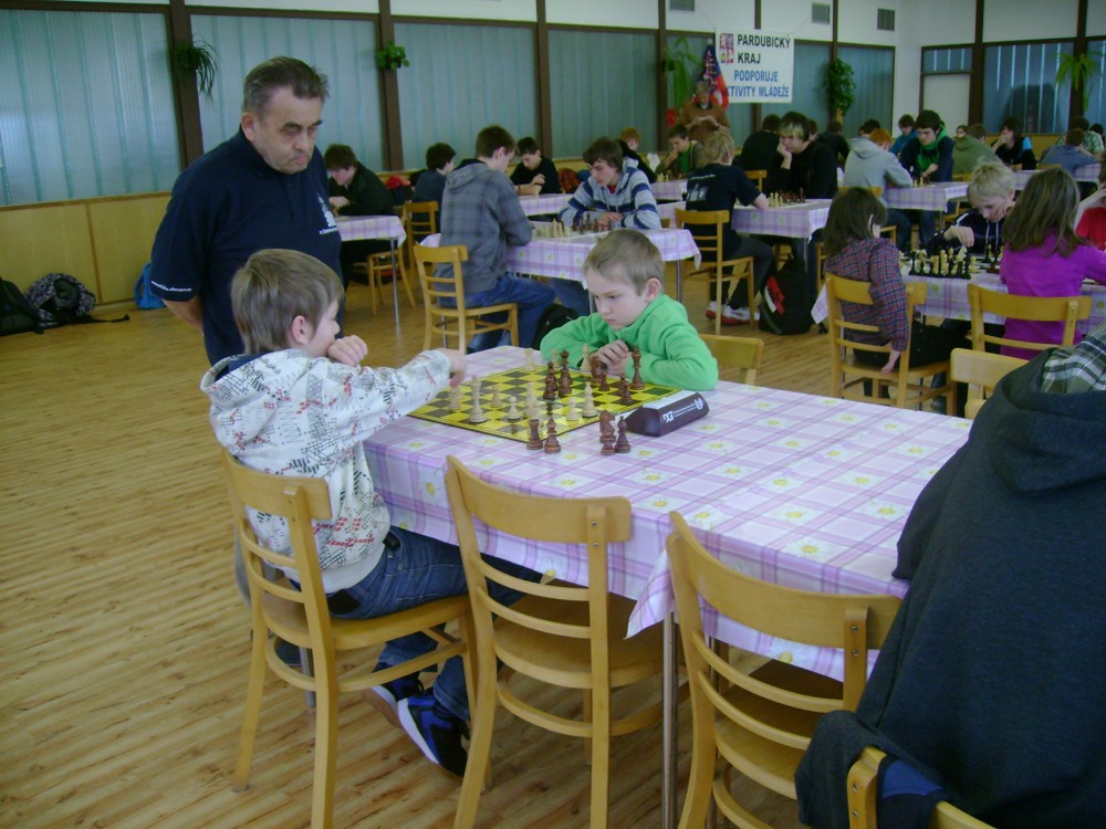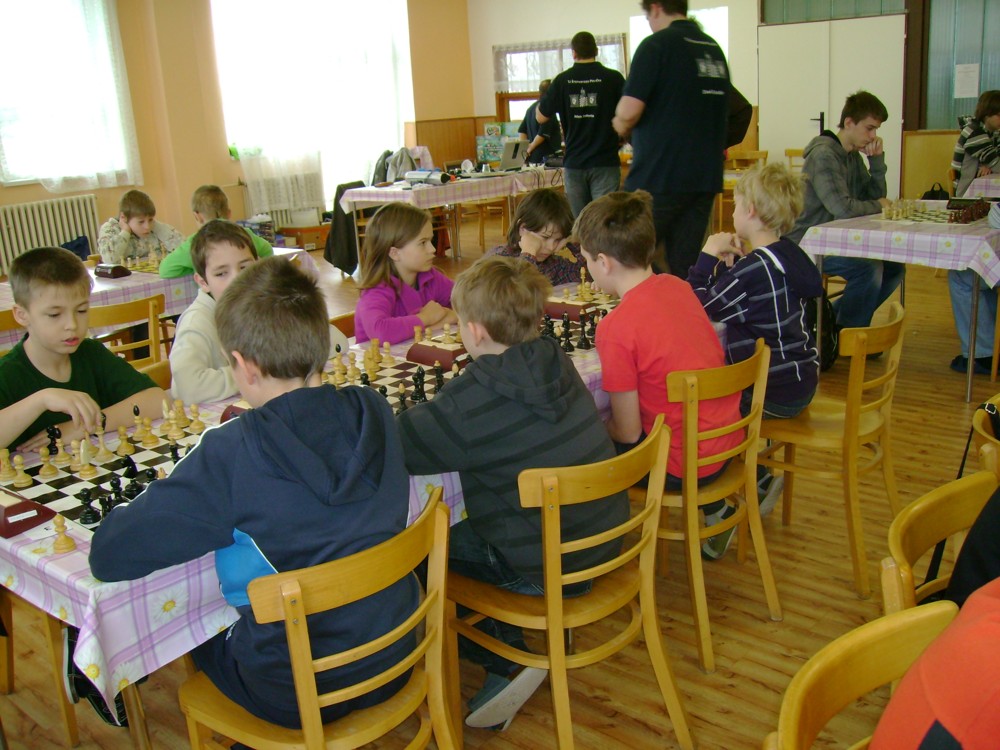 Kateřina Šmajzrová zas tak často nehraje; porážela slabší, půlila s trojkama; prohru si bohužel schovala do posledního kola na druhou šachovnici: o dvě hlavy menší Lukáš Pavlíček ukázal, že obětní Grecovu variantu má narozdíl od Katky nastudovanou. 4,5/7, 10. místo, 2. mezi dívkami, nejlepší z našich, ještě aby ne :-). Vít Holásek hrál svůj solidní standard, moc však nestíhal  hrací tempo (ve třetím kole přehrál Dvořáka, ale nebyl schopen zrychlit a spadnul). 4,5/7, 13. místo, dejme tomu. Veronika Šmajzrová po slabším výsledku ze Třebové dala vzpomenout na Orlickou šachovnici. Dařilo se jí, bojovala proti mnohem větším klukům, blýskla se výhrou nad Lukášem Paukertem. 4,5/7, 14. místo, 3. mezi dívkami, v tomto případě rozhodně úspěch! Martin Paukert už nehrál ani nepamatuju, tady se po startu 1/3 zvedl, vyhrál pak třikrát v řadě, mj. nad Monikou Ryšavou a předstihl mnoho našich zkušenějších hráčů (včetně staršího bráchy). 4/7, 18. místo. Vašek Grundman pokazil první kolo proti Marušce Vaškové, pak to bylo dobré, škoda posledního kola. 4/7, 19. místo. K šachové knížce, kterou studoval, ve vlaku, přidal další, kterou vyhrál – a nikdo z hráčů před ním po ní nesáhl! Lukáš Paukert musel po prohře s Verunkou Šmajzrovou dohánět terén ze zadních pozic. 4/7, 21. místo, na Lukáše sotva průměr. Naše čtyřbodové uzavírá Jirka Píše, i on mohl chtít po úspěchu ve Třebové (postup do finále kat. H12) víc. 4/7, 22. místo.