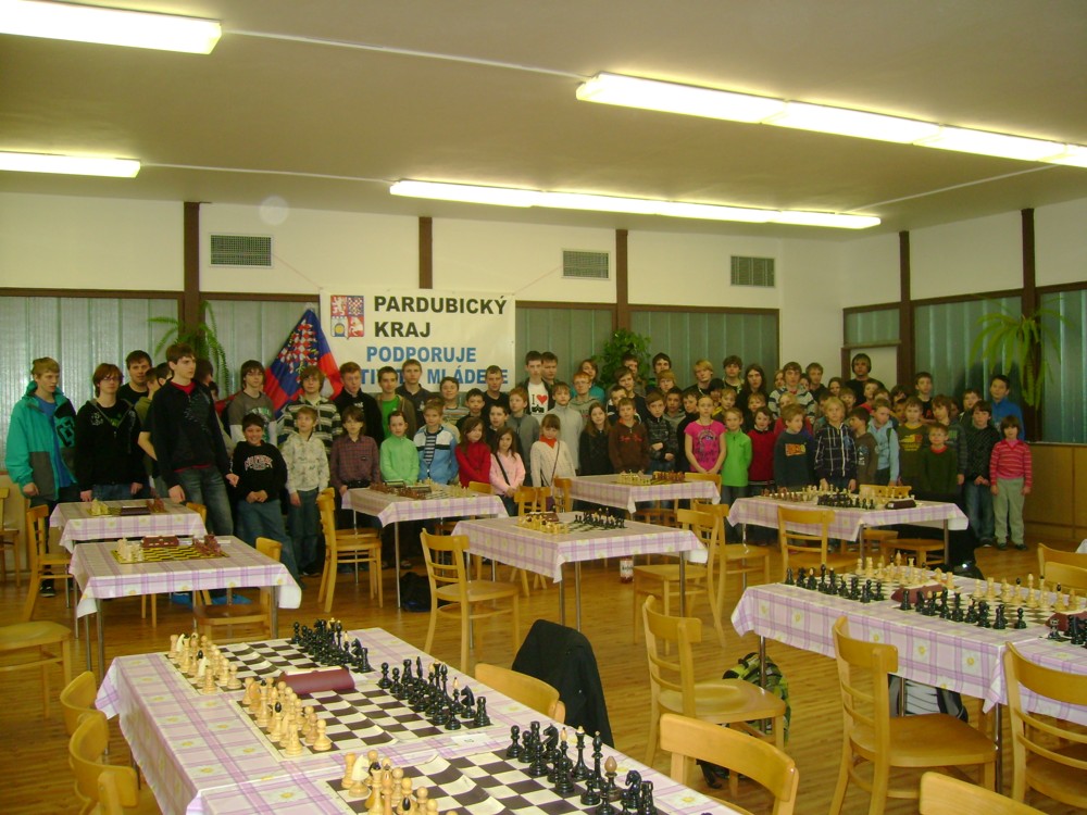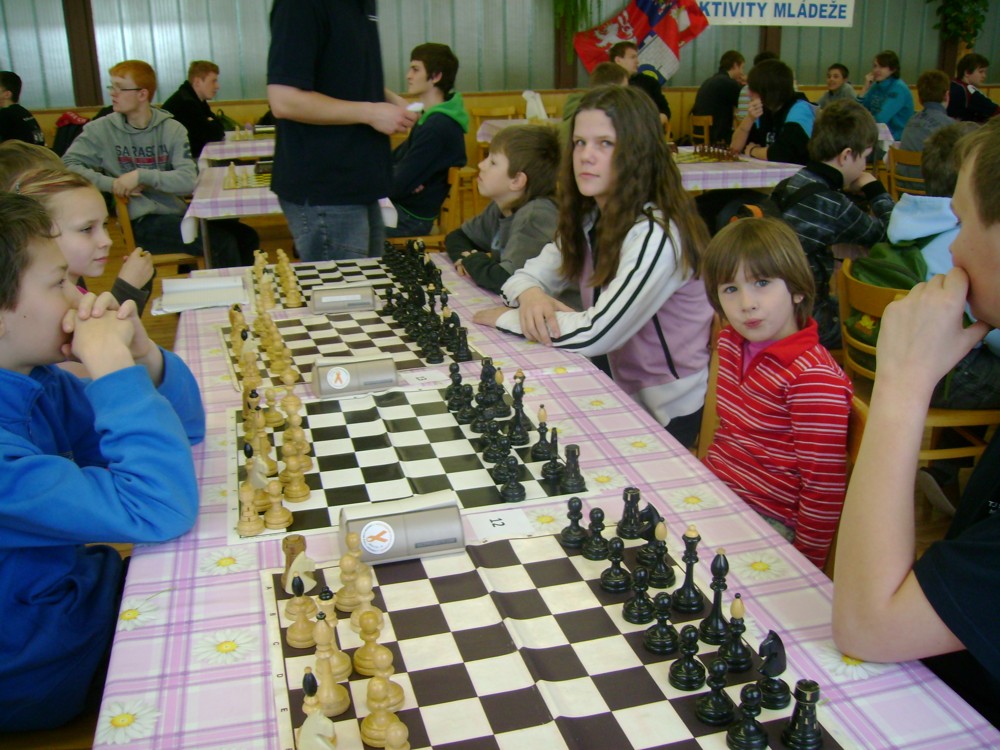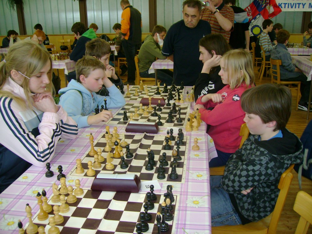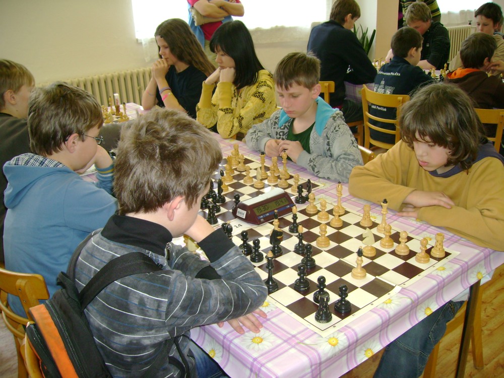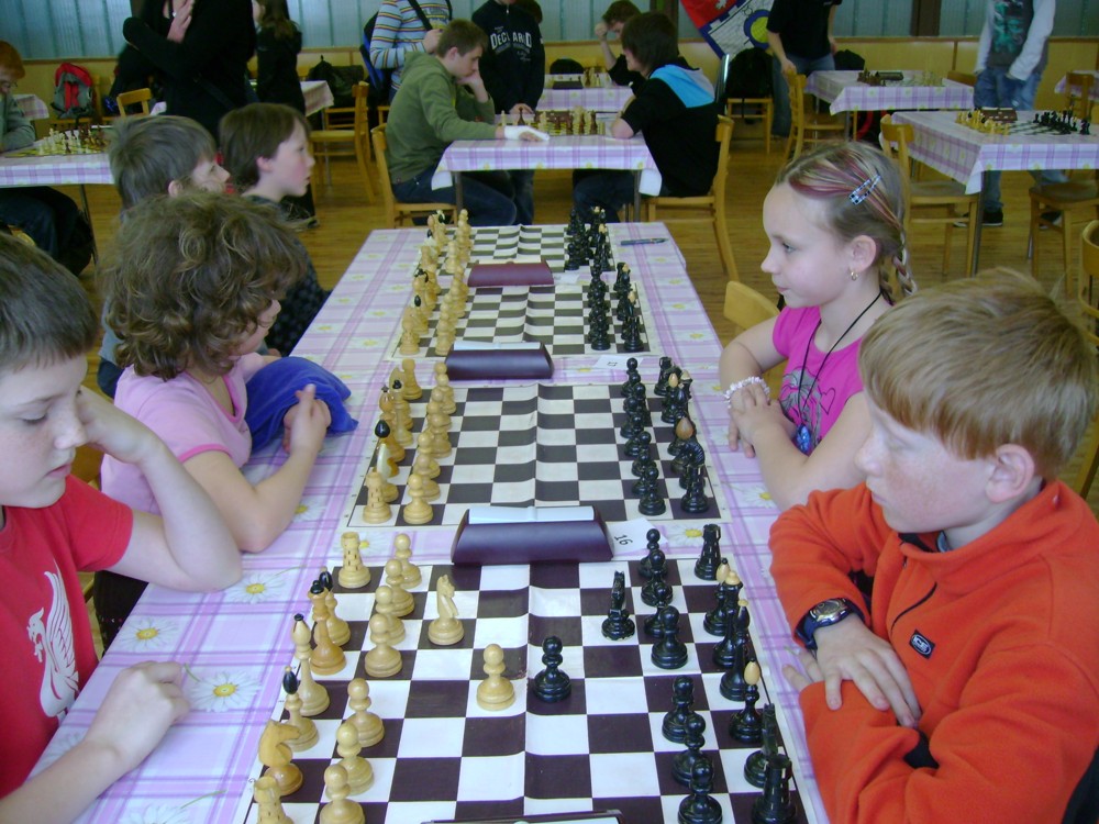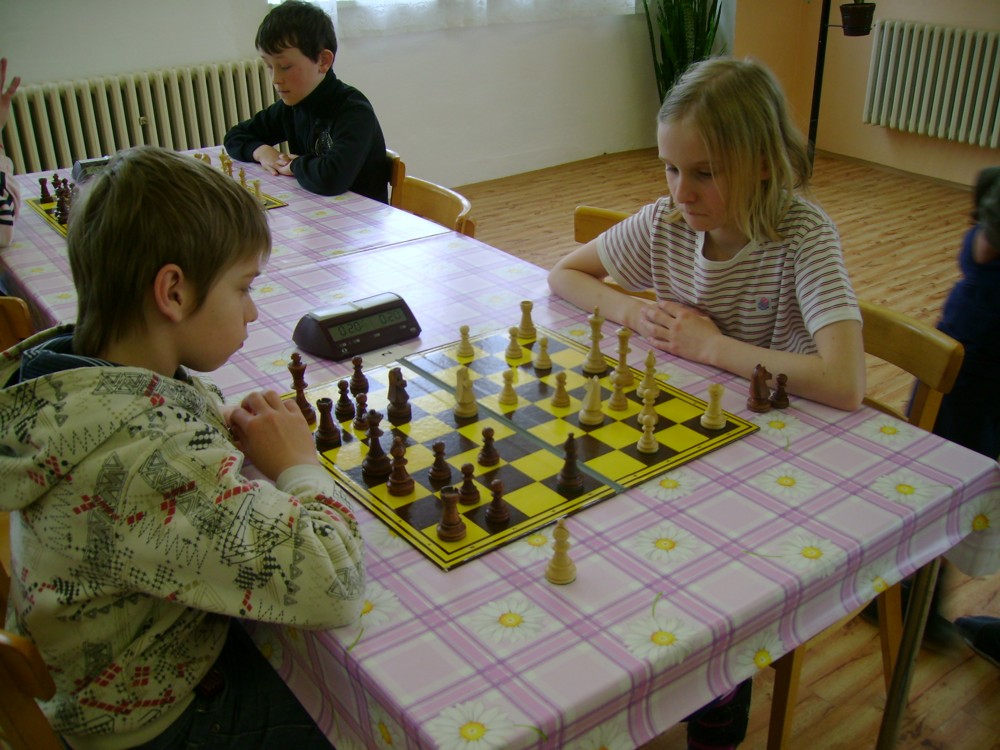 Kateřina Šmajzrová zas tak často nehraje; porážela slabší, půlila s trojkama; prohru si bohužel schovala do posledního kola na druhou šachovnici: o dvě hlavy menší Lukáš Pavlíček ukázal, že obětní Grecovu variantu má narozdíl od Katky nastudovanou. 4,5/7, 10. místo, 2. mezi dívkami, nejlepší z našich, ještě aby ne :-). Vít Holásek hrál svůj solidní standard, moc však nestíhal  hrací tempo (ve třetím kole přehrál Dvořáka, ale nebyl schopen zrychlit a spadnul). 4,5/7, 13. místo, dejme tomu. Veronika Šmajzrová po slabším výsledku ze Třebové dala vzpomenout na Orlickou šachovnici. Dařilo se jí, bojovala proti mnohem větším klukům, blýskla se výhrou nad Lukášem Paukertem. 4,5/7, 14. místo, 3. mezi dívkami, v tomto případě rozhodně úspěch! Martin Paukert už nehrál ani nepamatuju, tady se po startu 1/3 zvedl, vyhrál pak třikrát v řadě, mj. nad Monikou Ryšavou a předstihl mnoho našich zkušenějších hráčů (včetně staršího bráchy). 4/7, 18. místo. Vašek Grundman pokazil první kolo proti Marušce Vaškové, pak to bylo dobré, škoda posledního kola. 4/7, 19. místo. K šachové knížce, kterou studoval, ve vlaku, přidal další, kterou vyhrál – a nikdo z hráčů před ním po ní nesáhl! Lukáš Paukert musel po prohře s Verunkou Šmajzrovou dohánět terén ze zadních pozic. 4/7, 21. místo, na Lukáše sotva průměr. Naše čtyřbodové uzavírá Jirka Píše, i on mohl chtít po úspěchu ve Třebové (postup do finále kat. H12) víc. 4/7, 22. místo.