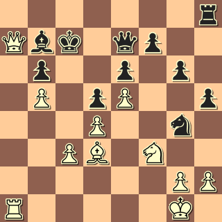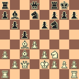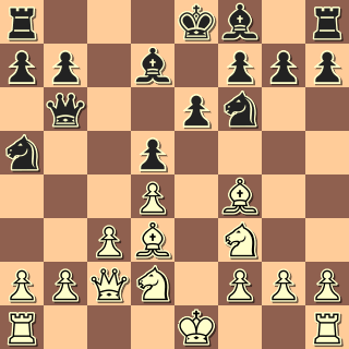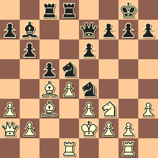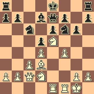 Na to, že můj soupeř hraje závodně prvním rokem, to tahá velice slušně. Přesto jsem si řekl, že se pustím do pozic, které obvykle nehraju, abych se taky naučil něco novýho … A tak se objevila Nimcovičova indická (bílý tomu, tuším, říkal dámský gambit 🙂 ). Po nenáročném zahájení se soupeř obával zahrát malou rošádu a odvážil se tahu 12. Ke2?.