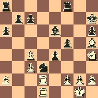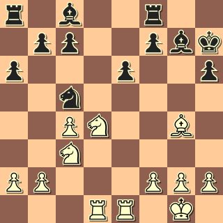 11. … dxe5 12.dxe5 Jc6 Aha! Podobné pocity míval asi Tarrasch proti hypermodernistům: jsem narozdíl od soupeře vyvinutej, ovládám centrum, užuž hledám rozhodující převahu – ale soupeř uchopil pozici jinak a rýsujou se problémy. 13. Sf4 De7 14. De3 Dc5 15. Dxc5 Jxc5 16. Vfe1 g5 První nápor na pe5 jsem ustál, přichází však druhý. Viděl jsem ale, že se zahojím na pg4, a říkal jsem si, že nevyvinutý soupeř si takovou operaci jen kvůli zisku centrálního éčka za okrajové géčko nemůže dovolit. 17. Sg3 g4 18. Jd4 Jxe5 19. Sxe5 Sxe5 20. Sxg4 Sg7