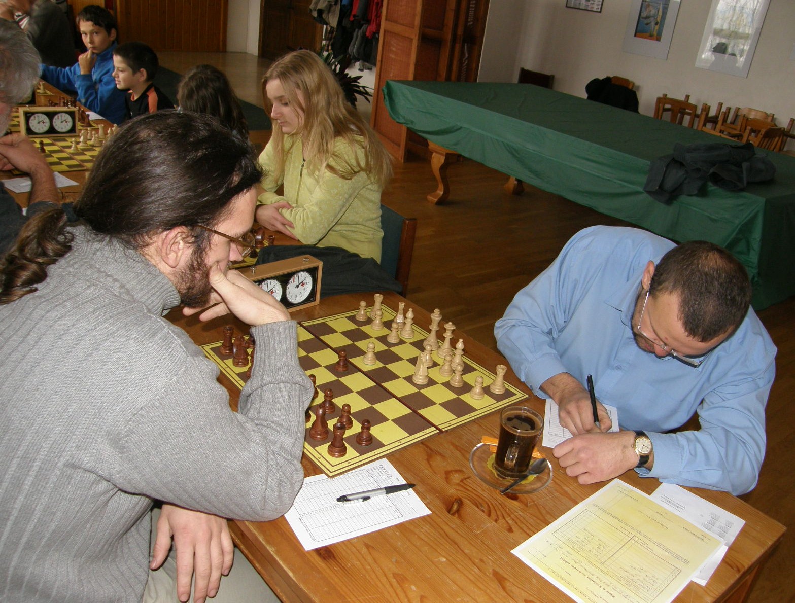 7. Jániš – Hon ½ cosi mezi pirckou a zavřenou sicilkou, kde se mi bílá pozice líbila nejprve více, v dlouhé věžovce čím dál méně. Nakonec Petr musel zachraňovat sice betonově remízovou, nicméně pořád opticky horší věžovku. Hostující hráč to hrál až za hrob, což se v těchto soutěžích tak nějak nedělá. Jestli to chtěl vyhrát silou vůle anebo našeho juniora nějak vystrašit, netuším. V hospodě se ještě teď tlemíme po 101. a posledním tahu 🙂