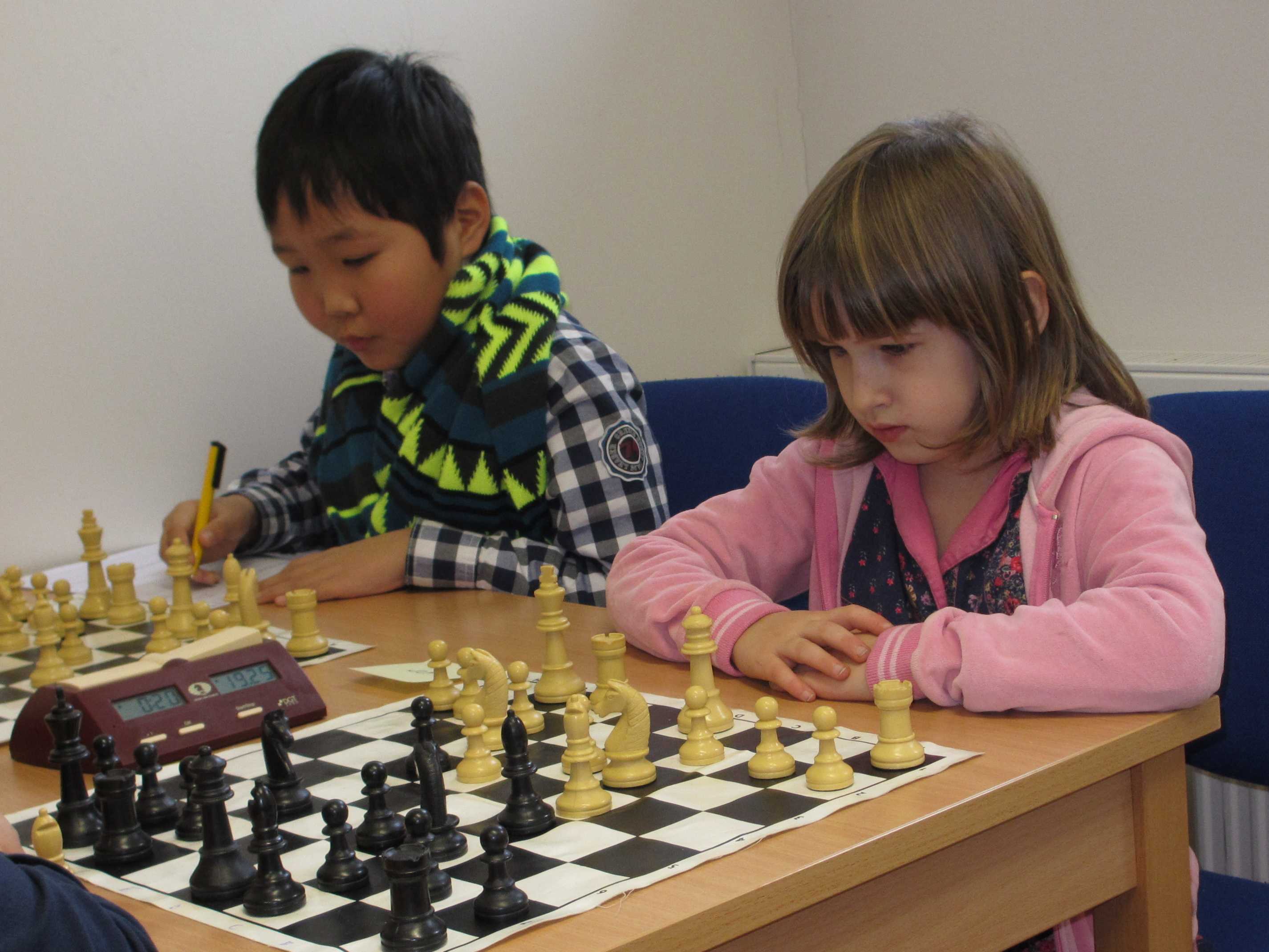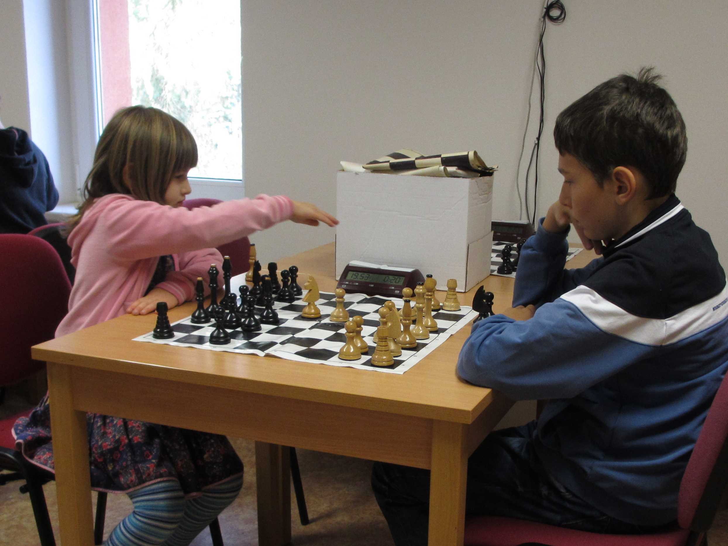Dominika Šmajzrová v šesti letech, myslím, debutovala – a hned ve čtrnáctkách, hlavním úkolem bylo osahat si figurky, hrát podle pravidel, dávat pozor na šustrmat, figurky brát a nenastavovat a uhýbat s nimi. Dokonce prý dala jednou šustrmat, ale soupeř sebral krytou dámu králem, což nereklamovala a hrálo se dál … 0/7, 54. místo, 10. mezi dívkami, všechno má teprve před sebou.