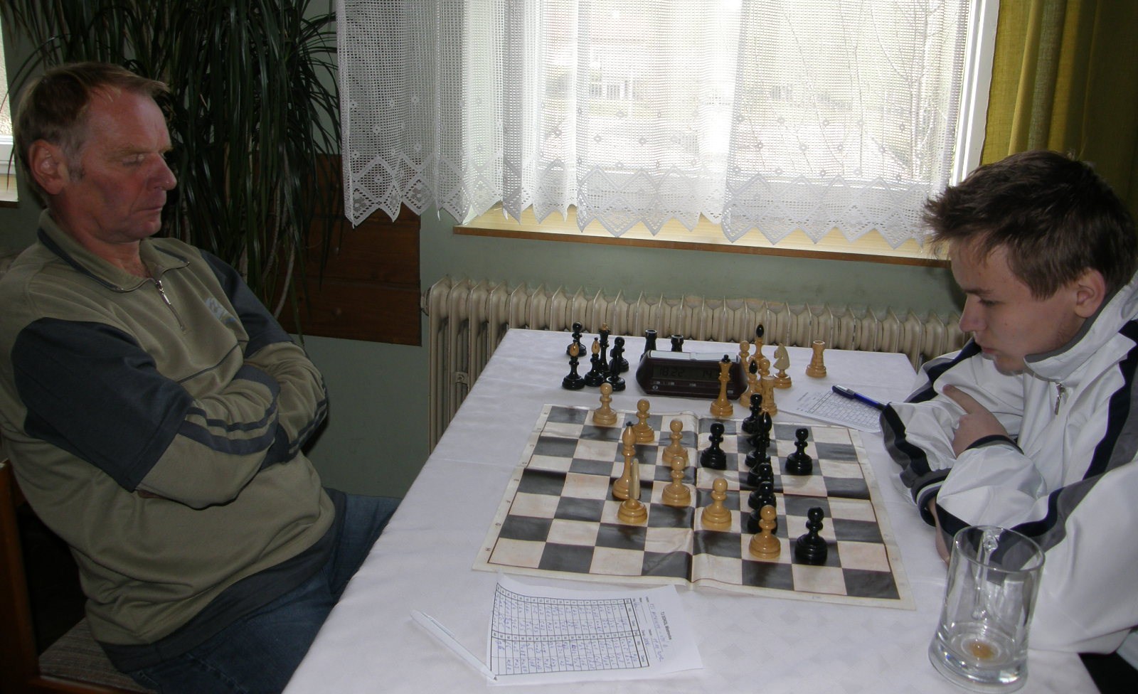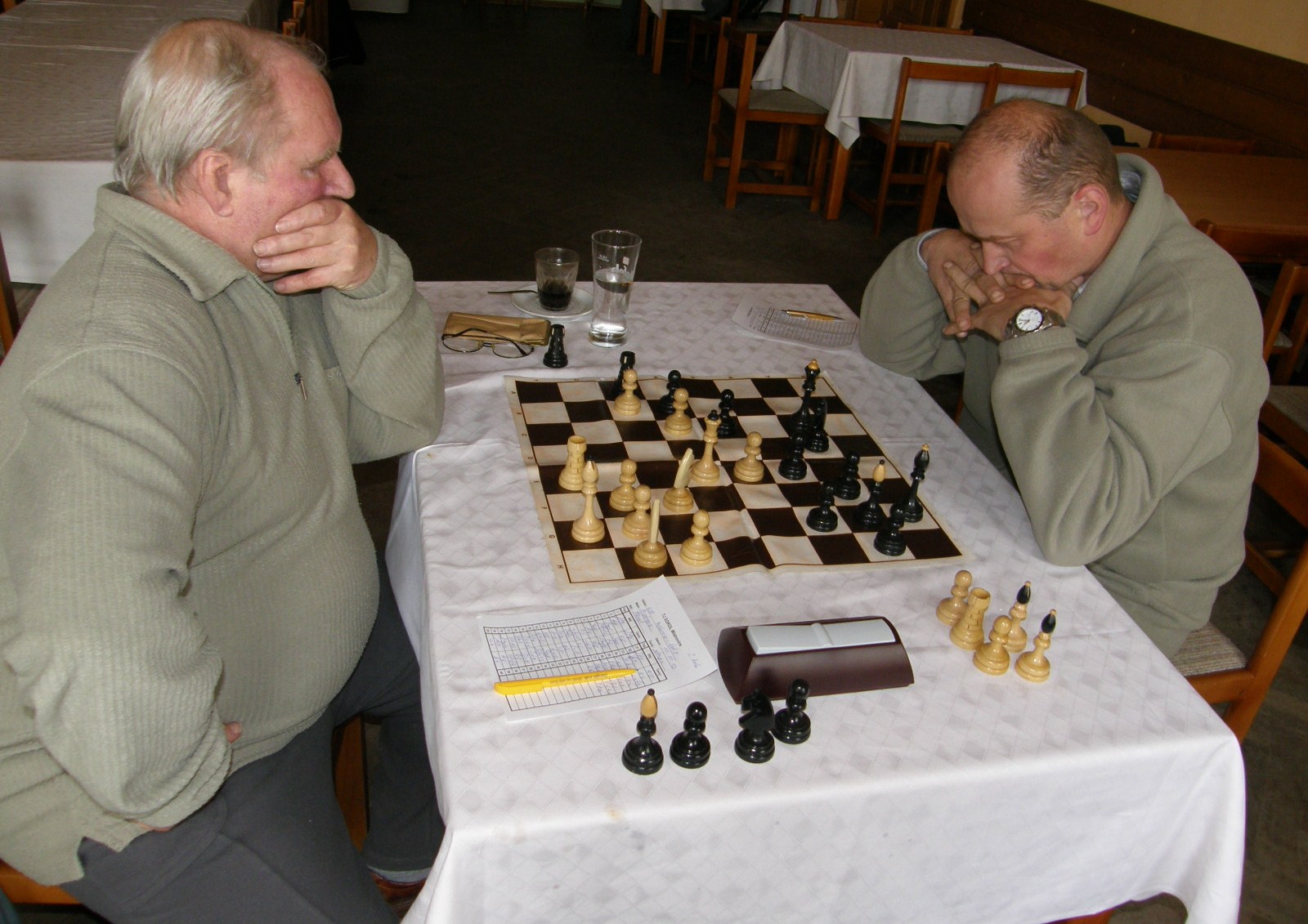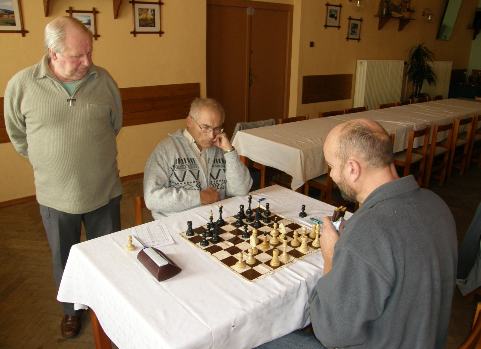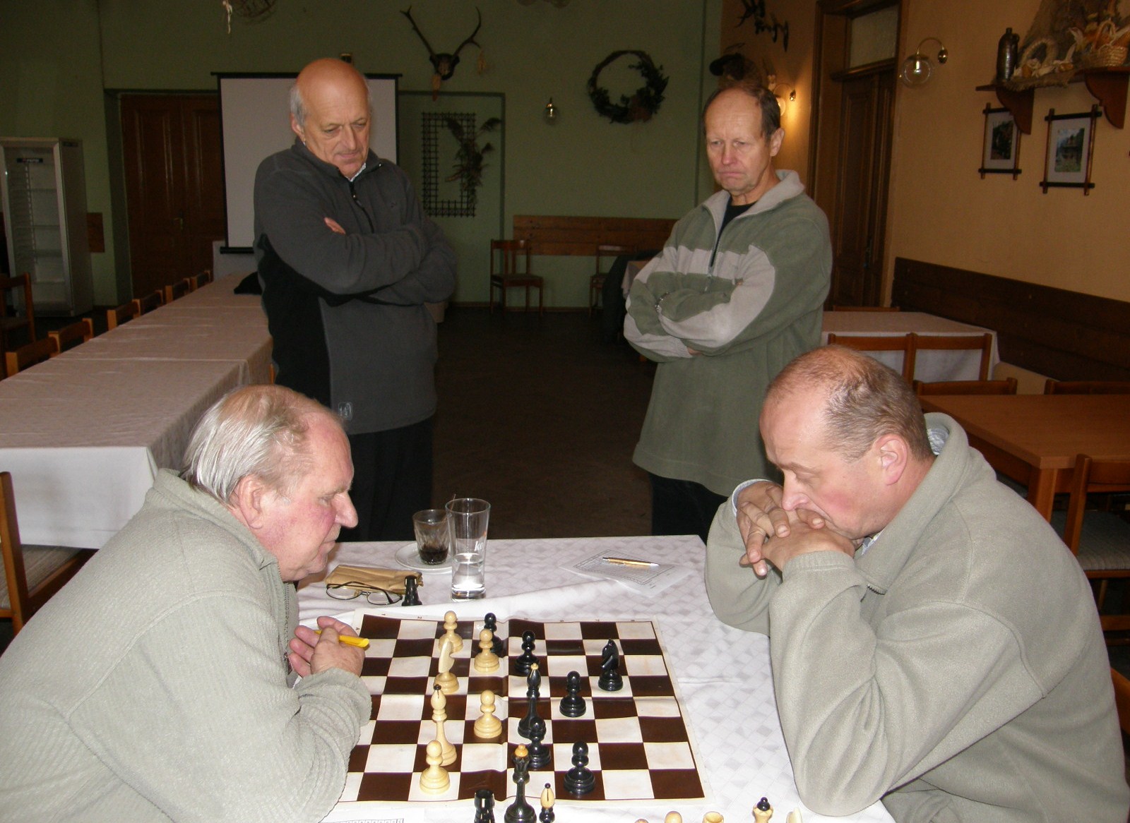 Nutno podotknout, že na sv. Martina se v káesce hrály až nečekaně teoretické šachy. Já na jedničce proti podobně vlasatému Václavu Kristlovi stavím klasický scheveningen a čekám, kdy a jestli se soupeř splete, na dvojce Luboš proti domácímu Rudolfu Valentovi hodlá odčinit minelu z prvního kola a zahajuje rázně grekovskou italskou. O stůl dál Petr John zkouší Pavla Sysra ze znalosti Budapešťského gambitu a je asi nemile překvapen jeho odmítnutím mně neznámým tahem e6, zatímco Jirka Fangl, jenž již v autě přislibuje zvýšenou bojovnost, nasazuje hru dámským pěšcem se Sg5, obsazuje centrum a jeho pozice působí aspoň od oka lépe. Poslední z našich Jarda Driemer se musí opět smířit s černými, proti Bronislavu Špinlerovi hraje opticky hezkého Grünfelda, ale soupeř skládá figurky na přirozená místa á la dámský gambit a postupně našeho matadora začíná přehrávat.