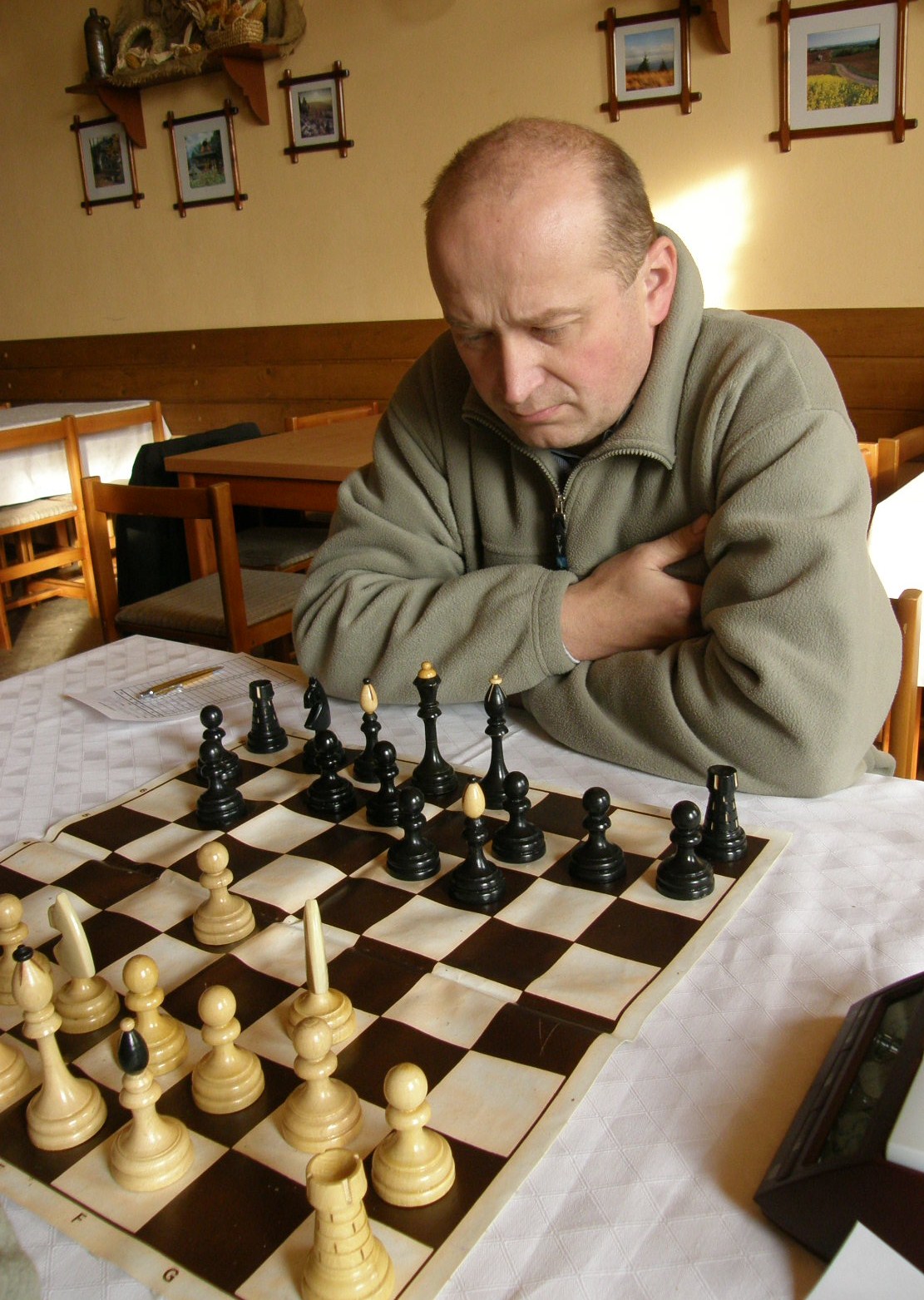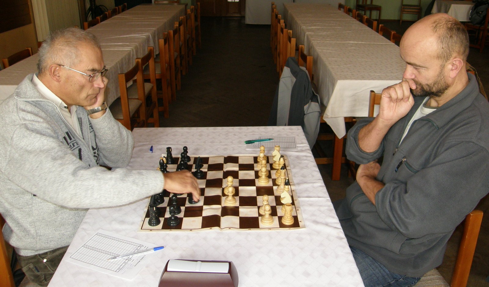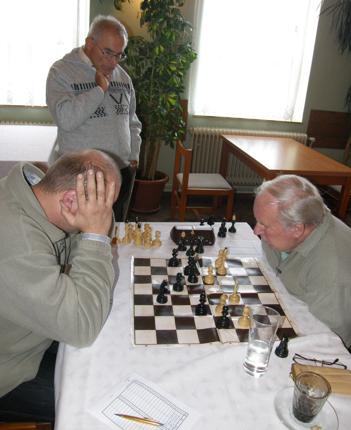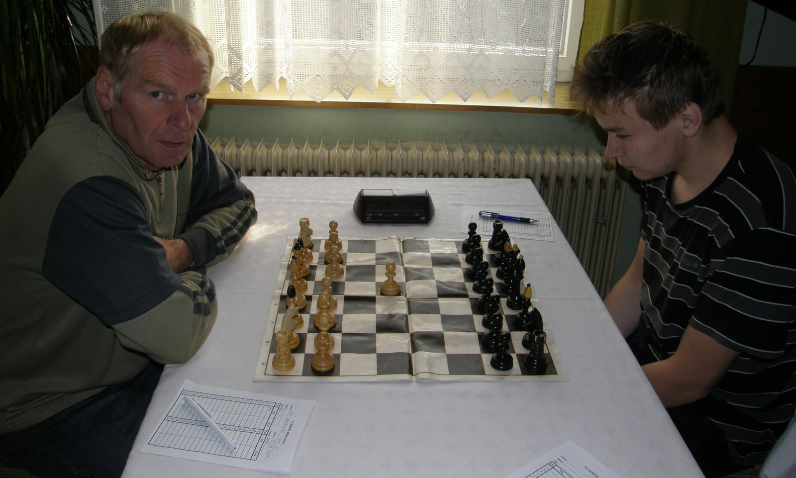 Nutno podotknout, že na sv. Martina se v káesce hrály až nečekaně teoretické šachy. Já na jedničce proti podobně vlasatému Václavu Kristlovi stavím klasický scheveningen a čekám, kdy a jestli se soupeř splete, na dvojce Luboš proti domácímu Rudolfu Valentovi hodlá odčinit minelu z prvního kola a zahajuje rázně grekovskou italskou. O stůl dál Petr John zkouší Pavla Sysra ze znalosti Budapešťského gambitu a je asi nemile překvapen jeho odmítnutím mně neznámým tahem e6, zatímco Jirka Fangl, jenž již v autě přislibuje zvýšenou bojovnost, nasazuje hru dámským pěšcem se Sg5, obsazuje centrum a jeho pozice působí aspoň od oka lépe. Poslední z našich Jarda Driemer se musí opět smířit s černými, proti Bronislavu Špinlerovi hraje opticky hezkého Grünfelda, ale soupeř skládá figurky na přirozená místa á la dámský gambit a postupně našeho matadora začíná přehrávat.