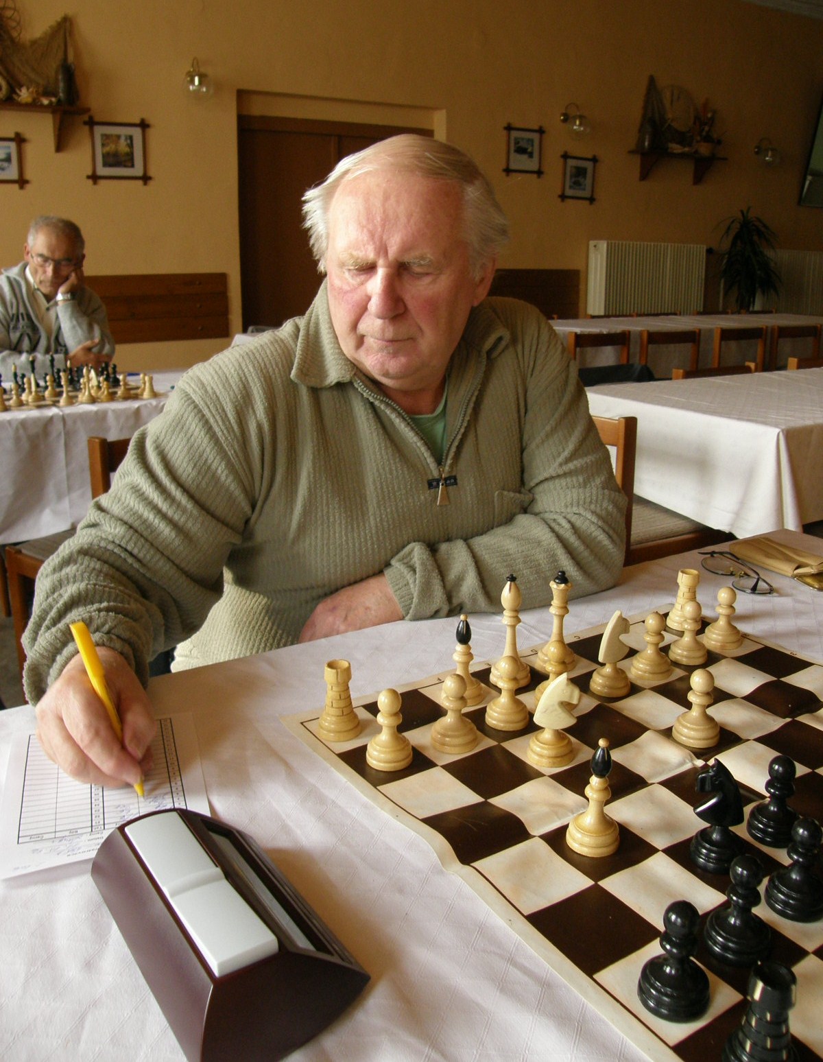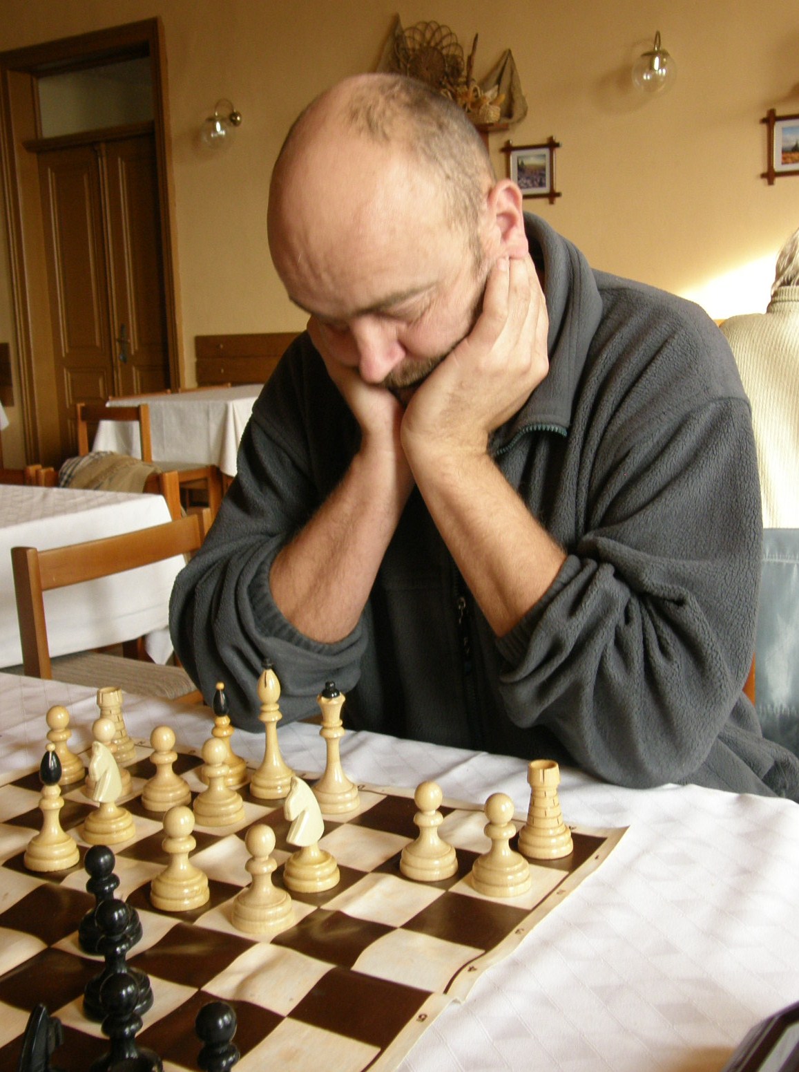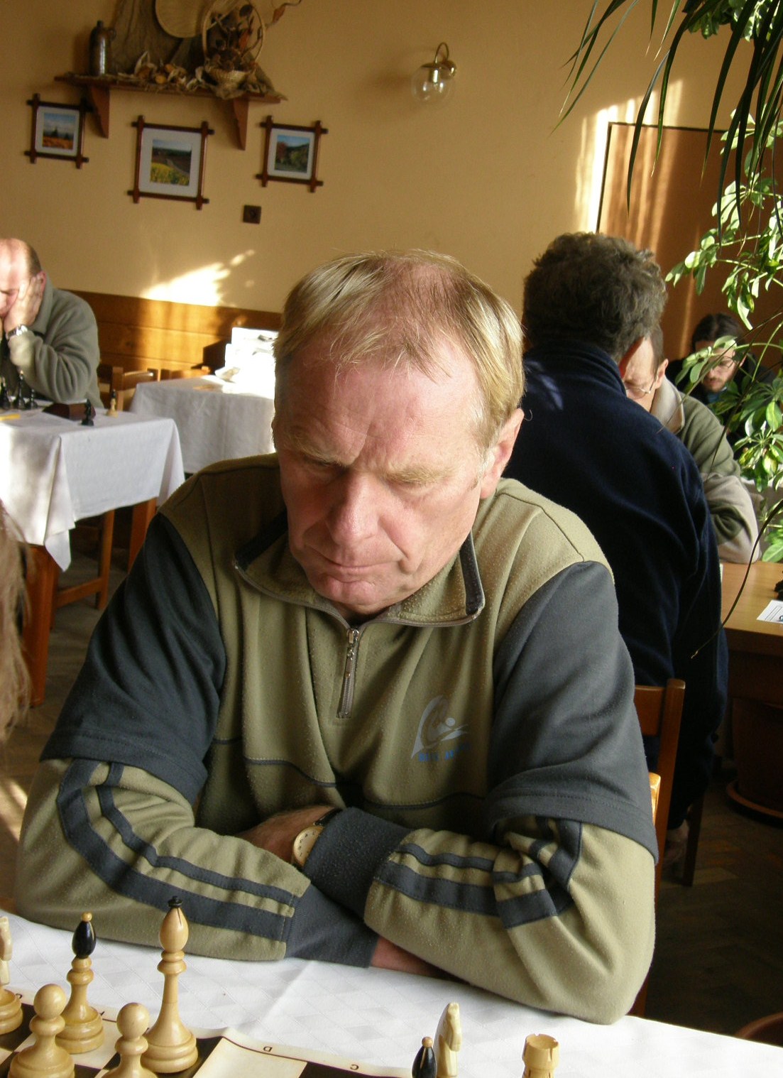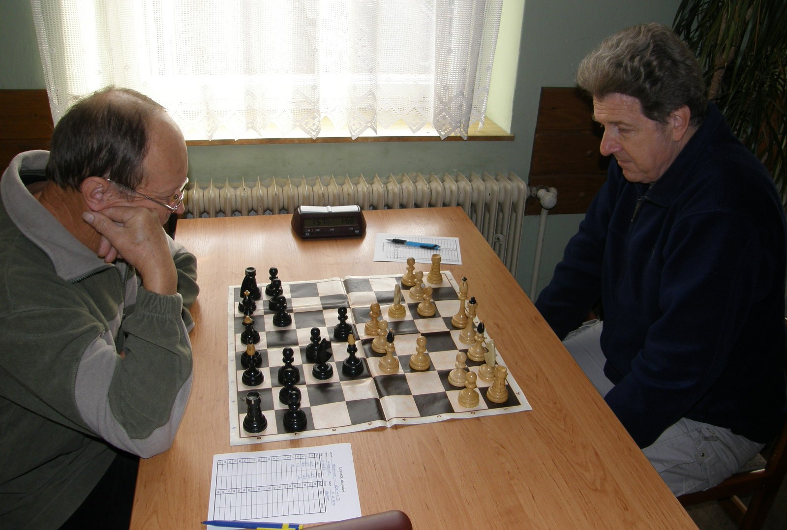 Nutno podotknout, že na sv. Martina se v káesce hrály až nečekaně teoretické šachy. Já na jedničce proti podobně vlasatému Václavu Kristlovi stavím klasický scheveningen a čekám, kdy a jestli se soupeř splete, na dvojce Luboš proti domácímu Rudolfu Valentovi hodlá odčinit minelu z prvního kola a zahajuje rázně grekovskou italskou. O stůl dál Petr John zkouší Pavla Sysra ze znalosti Budapešťského gambitu a je asi nemile překvapen jeho odmítnutím mně neznámým tahem e6, zatímco Jirka Fangl, jenž již v autě přislibuje zvýšenou bojovnost, nasazuje hru dámským pěšcem se Sg5, obsazuje centrum a jeho pozice působí aspoň od oka lépe. Poslední z našich Jarda Driemer se musí opět smířit s černými, proti Bronislavu Špinlerovi hraje opticky hezkého Grünfelda, ale soupeř skládá figurky na přirozená místa á la dámský gambit a postupně našeho matadora začíná přehrávat.