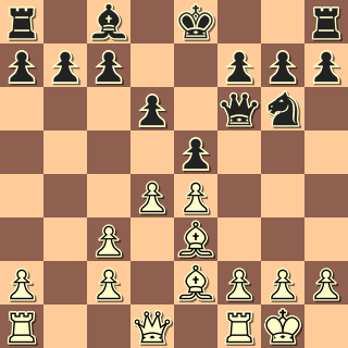 11. h3? Oslabení, tam chce přece útočit soupeř. 11. … Jf4 12. dxe5? Roztrhává pěšce. 12. … dxe5 13. Dd2 Dg6? Příliš přímočaré. Normální byla rocháda, dalo se už i obětovat 13. … Sxh3!?, ale to jde jen do výměn: 14. Sxf4 exf4 15. gxh3 f3 16. Sxf3 Dxf3 17. Dd3. 14. Sf3? (14. Sxf4!) 14. … Sxh3? Vycházelo 14. … Jxh3+ 15. Kh2 Df6! a jezdec vyklouzne. 15. Sxf4 exf4 16. Dxf4 O-O Útok černého skončil, nastává další fáze.17. Vfd1 Vad8? Nenápadná hrubka. BNTV 🙂