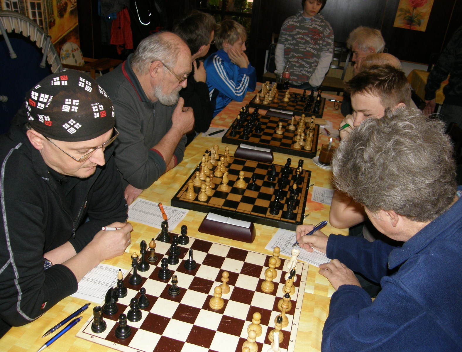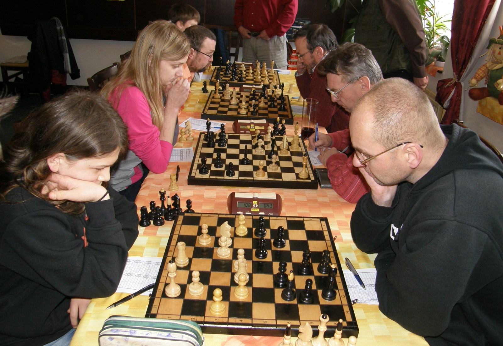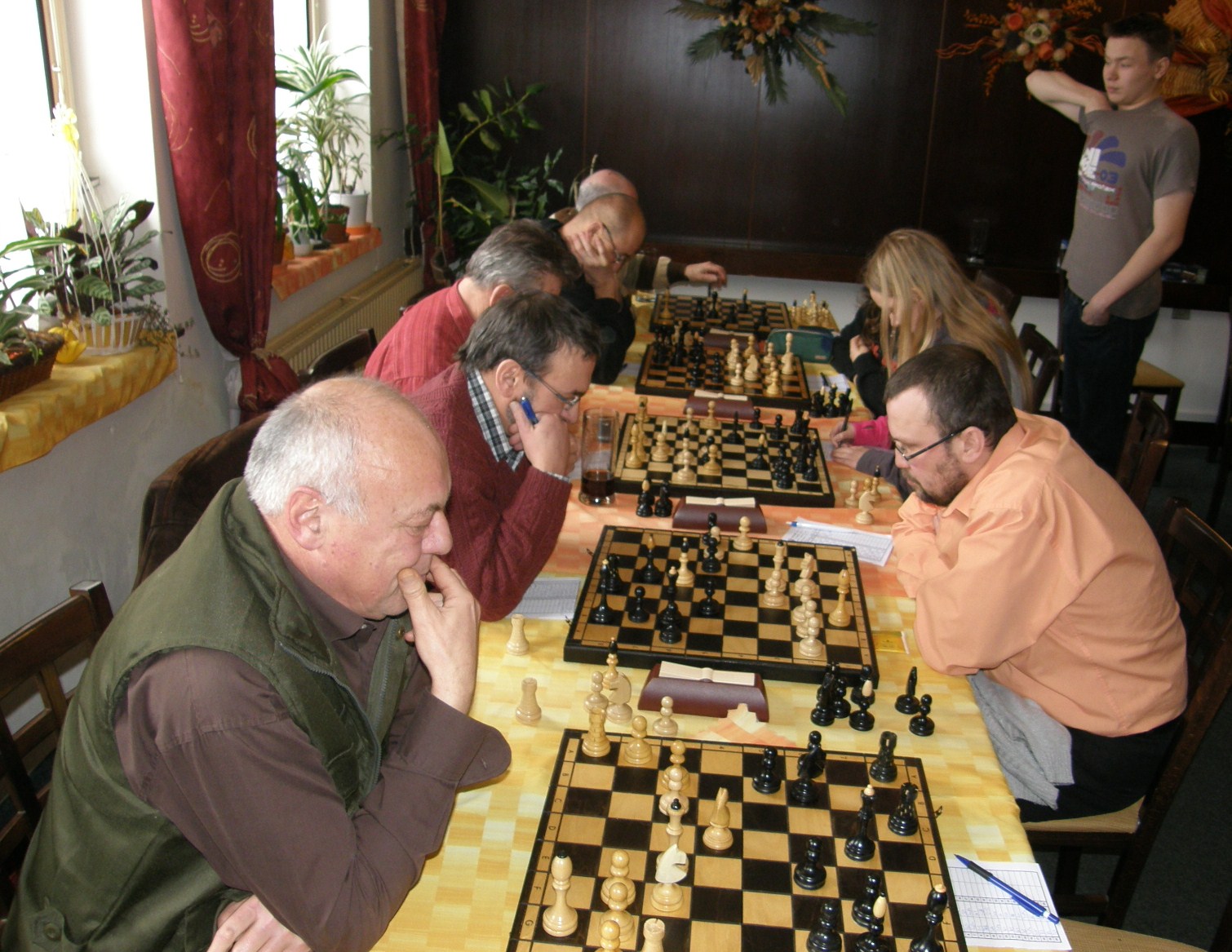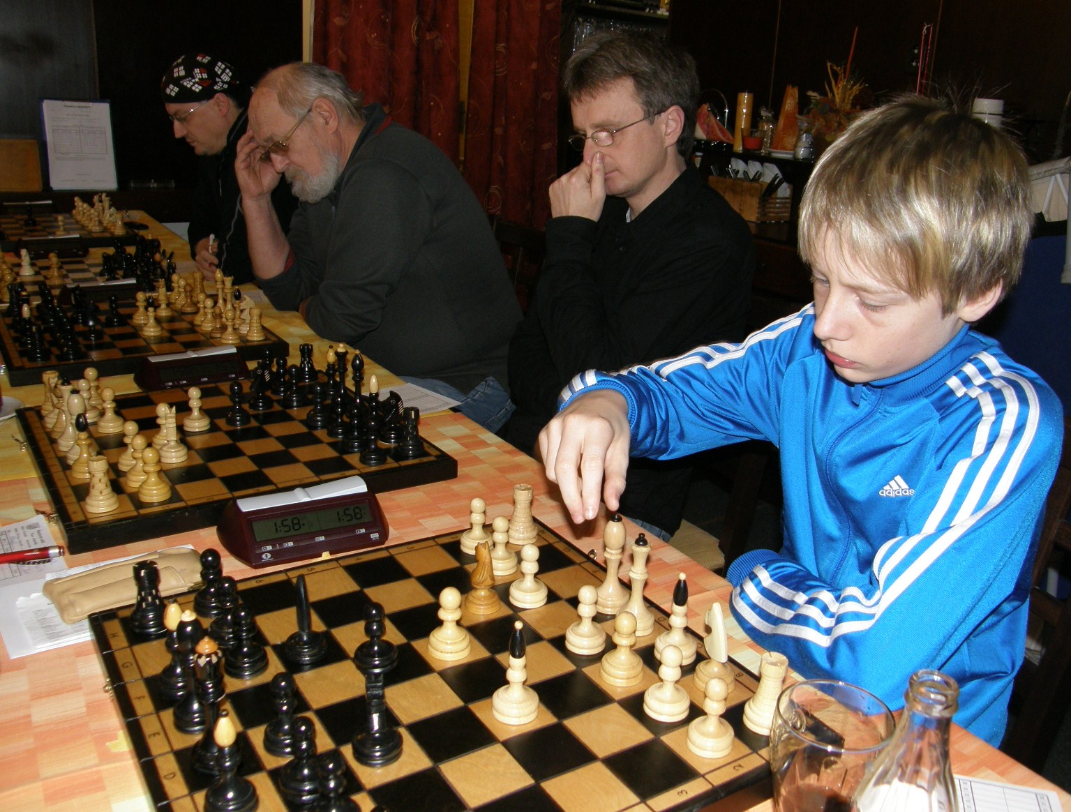 4. Víťa vyhráva. Kdo jiný než on by měl držet mužstvo! Já po půlhodině přemýšlení zvolil ten úplně nejpitomější tah a všechno zahodil, Vašek vyhrává. Jdu se rozdýchat. Mezitím Katčin soupeř dopochoval s pěšcem až na šestou řadu pěkně krytý kobylou. Další jeho pěšec také na šesté řadě. Kde jsou k čertu ti pešci navíc? Naštěští postupovat dál nechce, koněm odjíždí a Katka tak ze staženým srdcem může floka dobrat a nabídnout remízu.