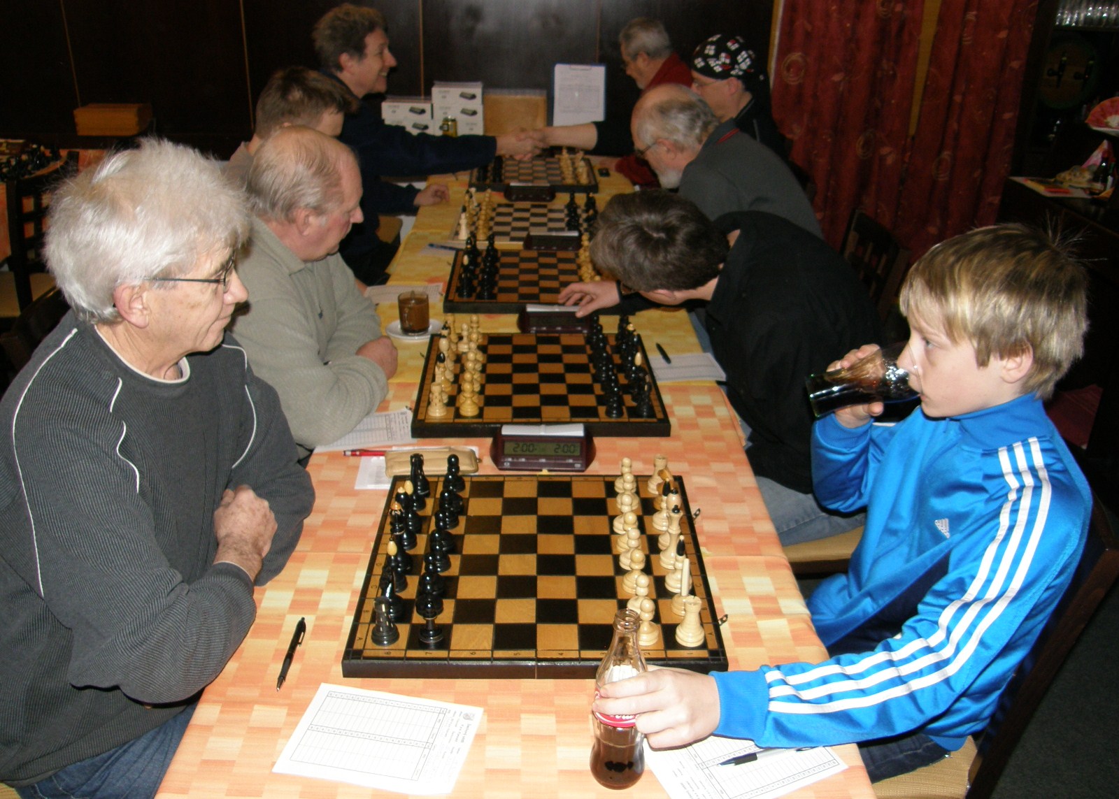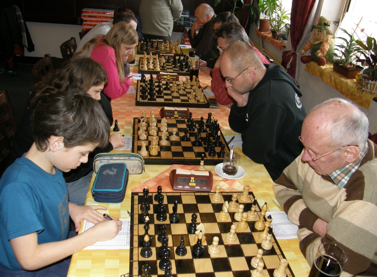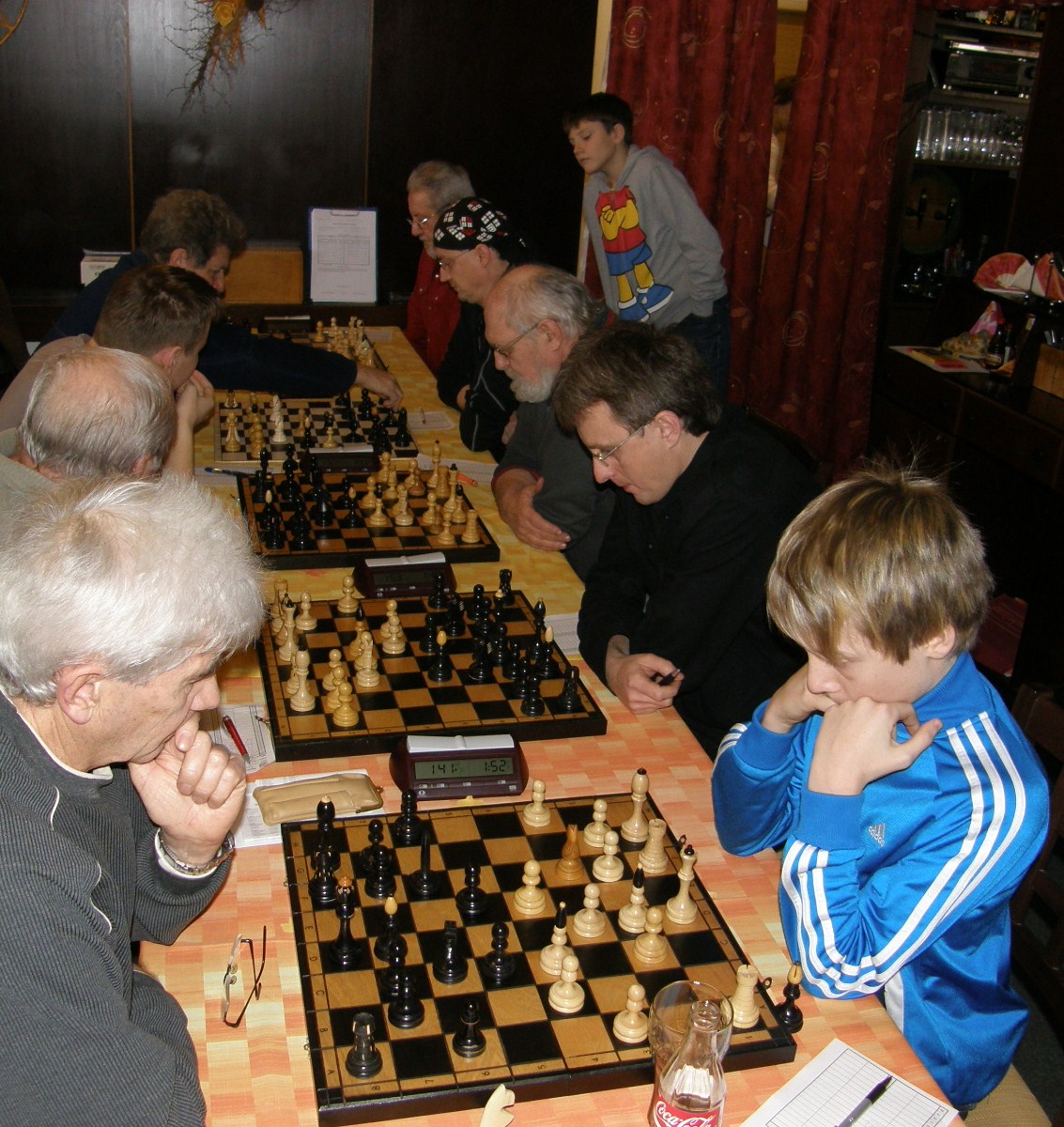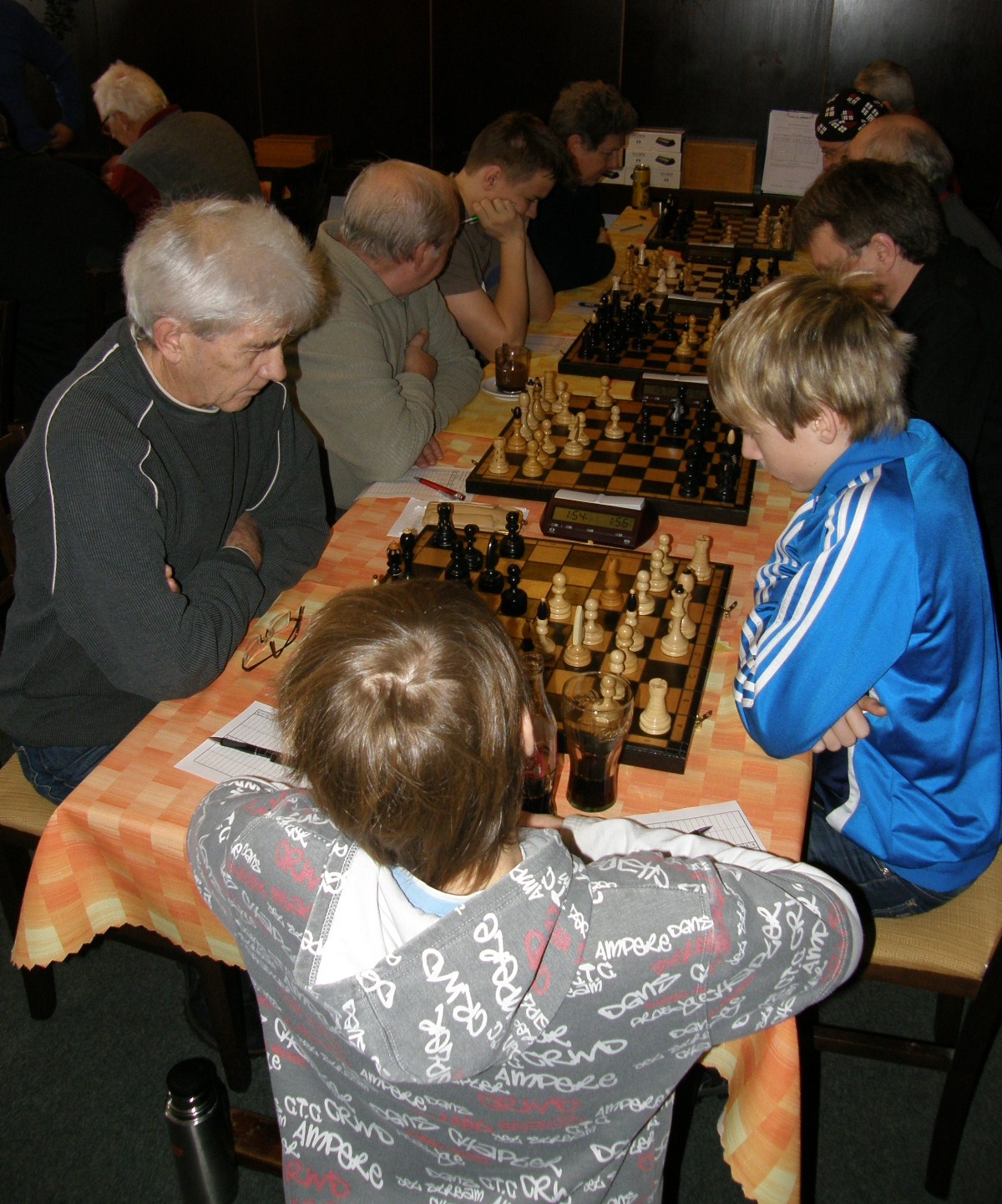 4. Víťa vyhráva. Kdo jiný než on by měl držet mužstvo! Já po půlhodině přemýšlení zvolil ten úplně nejpitomější tah a všechno zahodil, Vašek vyhrává. Jdu se rozdýchat. Mezitím Katčin soupeř dopochoval s pěšcem až na šestou řadu pěkně krytý kobylou. Další jeho pěšec také na šesté řadě. Kde jsou k čertu ti pešci navíc? Naštěští postupovat dál nechce, koněm odjíždí a Katka tak ze staženým srdcem může floka dobrat a nabídnout remízu.