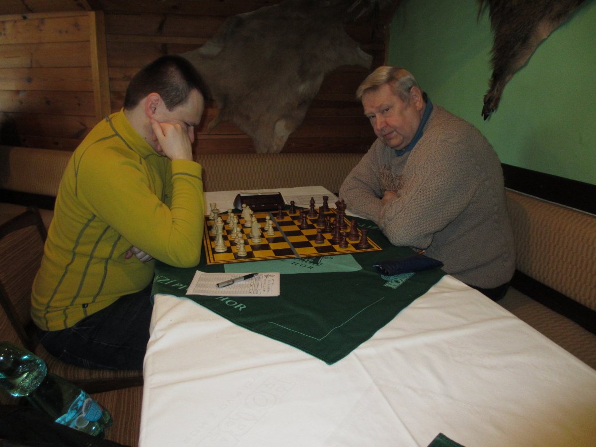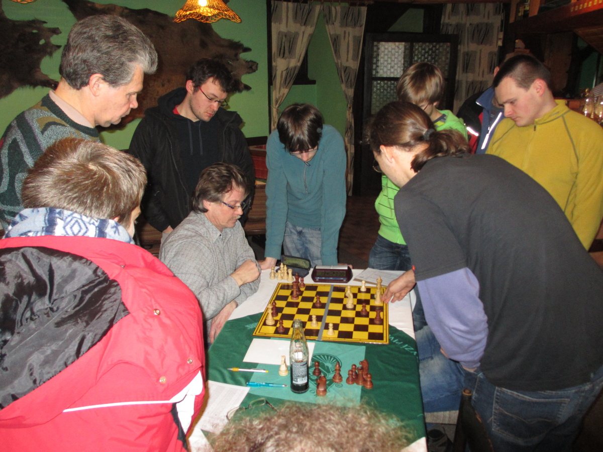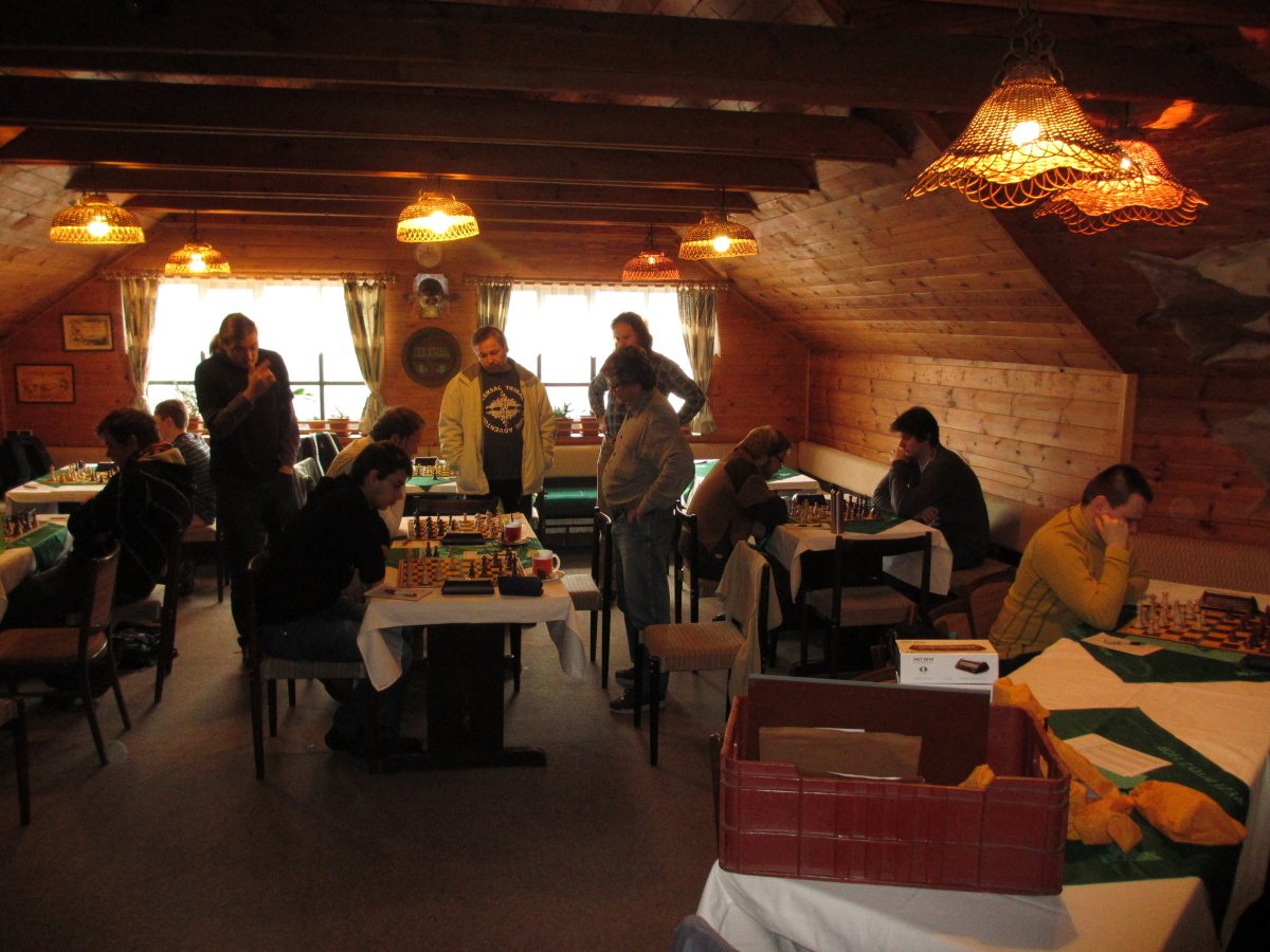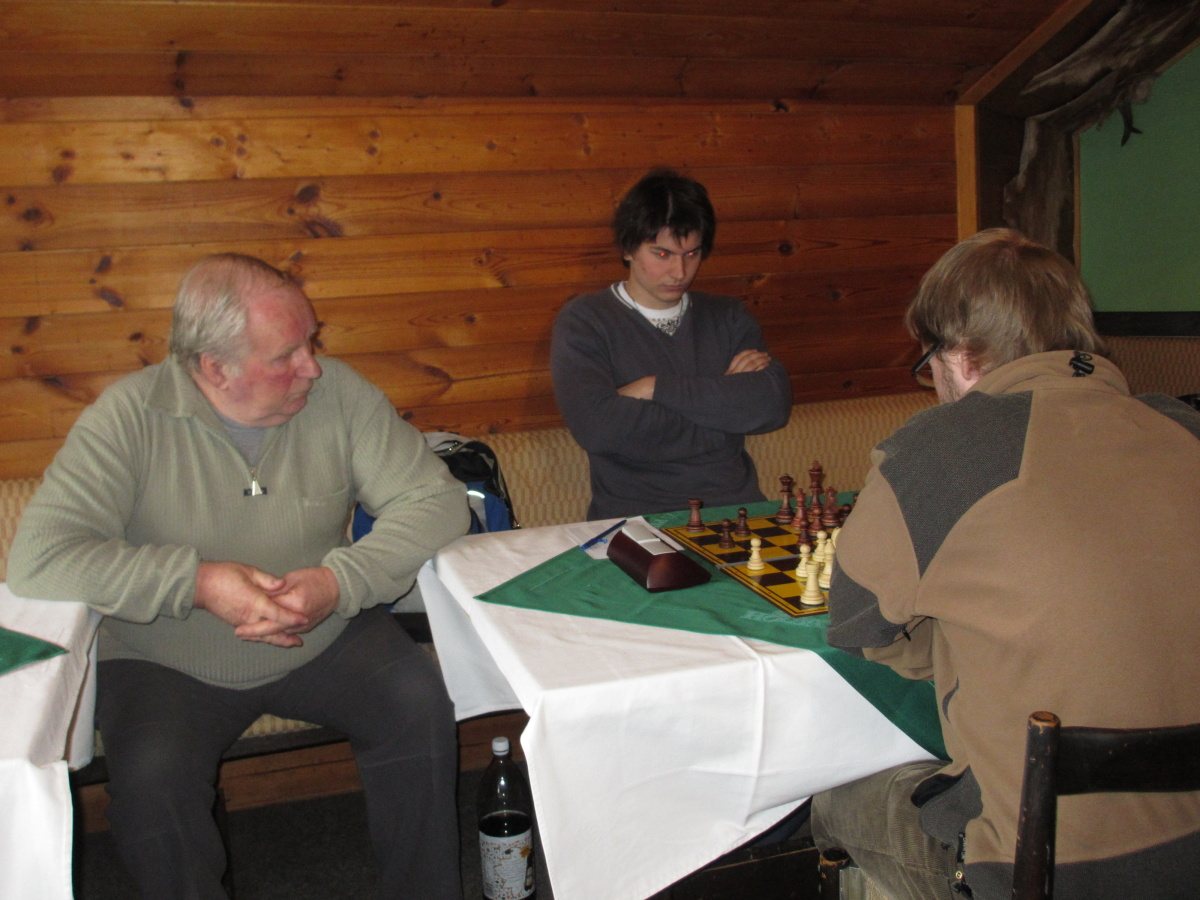 Po kontrolách se pořád hrají ty čtyři partie, špatná je jednička a dvojka (Martin a Vašek), naděje skýtají šestka a osmička (Petr a Jarda). Odcházím dolů, kde se v uvolněné atmosféře analyzuje, popíjí pivo alkoholické i údajně nealkoholické, dostávám utopence bez pečiva (je přece půst 😉 ) a jen občas já nebo jiní odbíháme obhlídnout horní patro, abychom se vraceli s výroky jako „kozel aby se v tom vyznal“, „radši nevím a nikdo radši neví“ nebo lakonicky „nehodnotím!“.