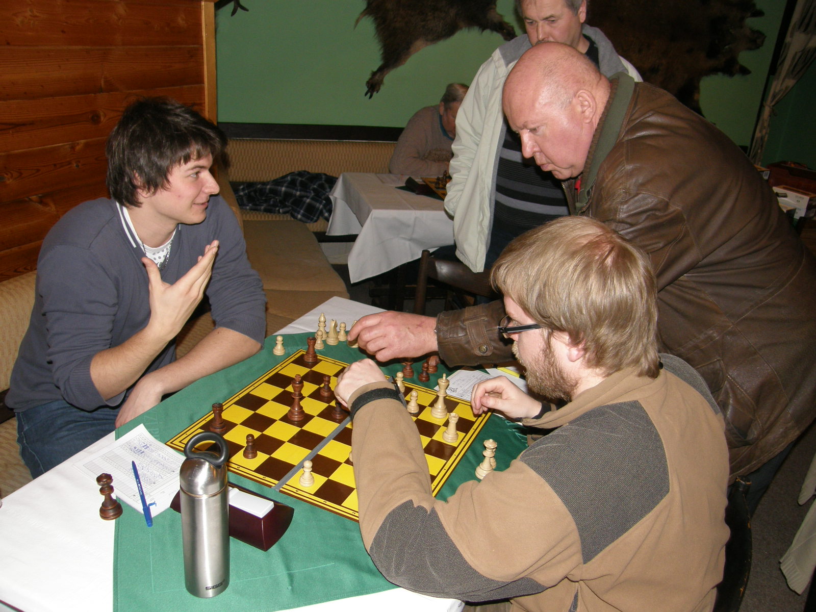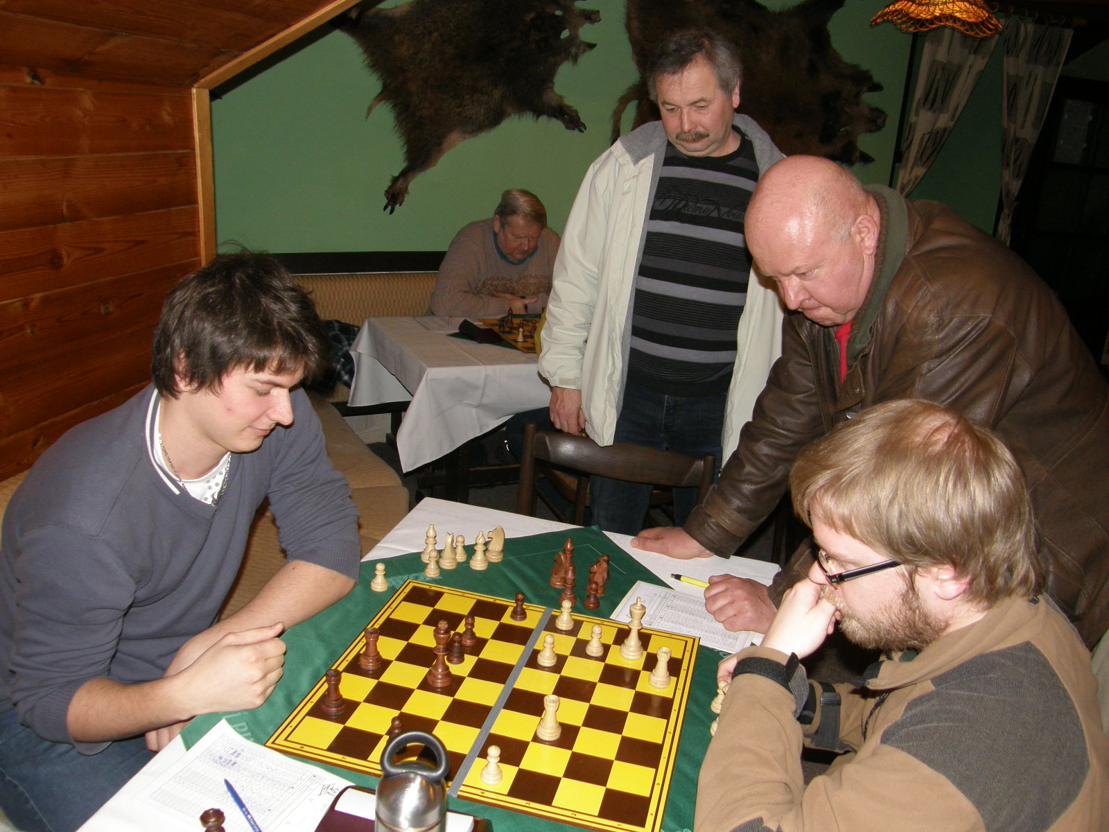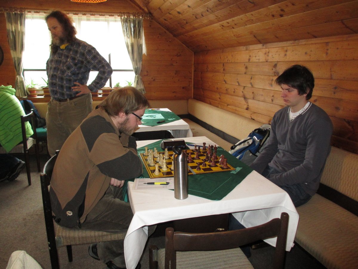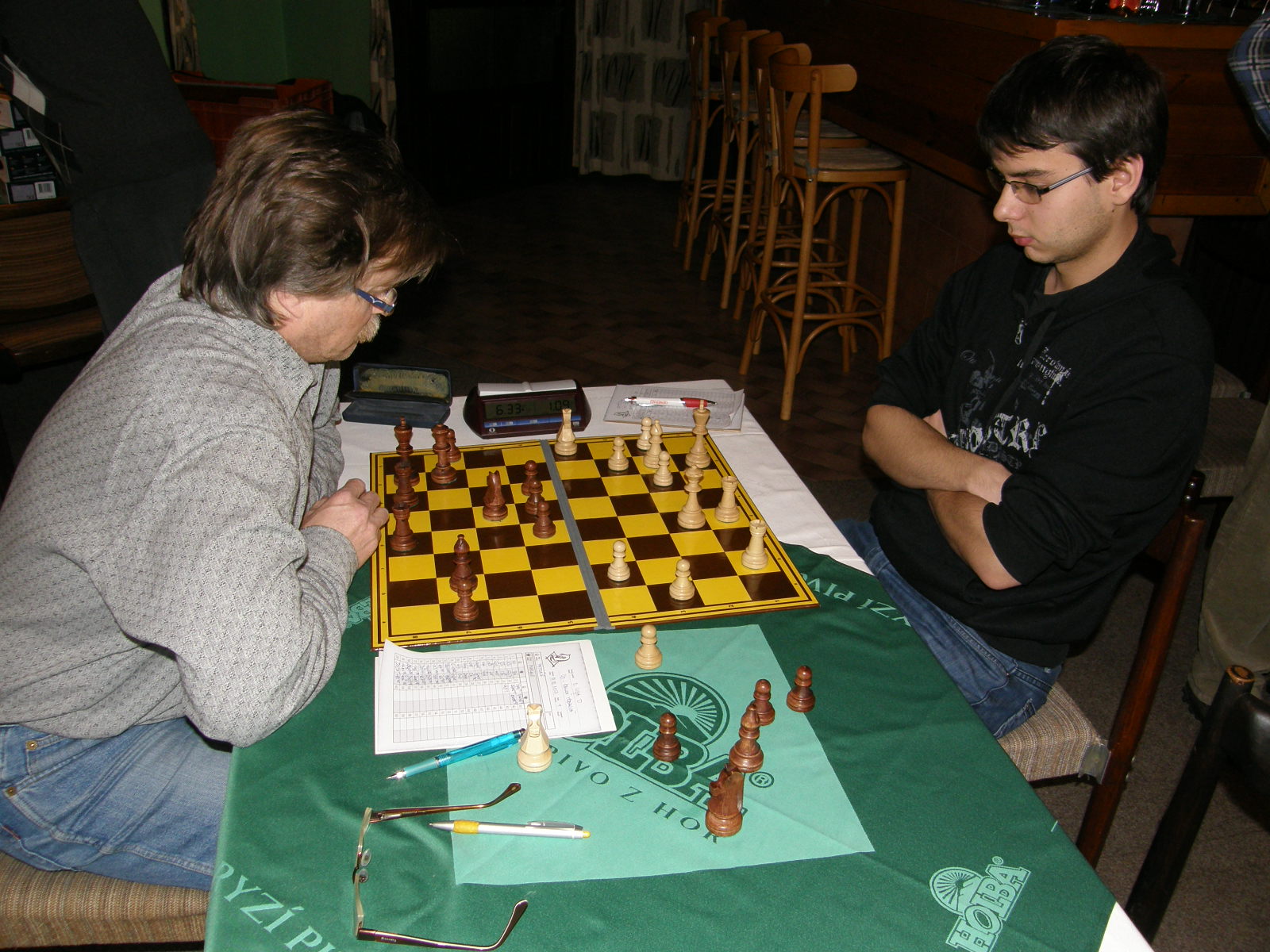 Po kontrolách se pořád hrají ty čtyři partie, špatná je jednička a dvojka (Martin a Vašek), naděje skýtají šestka a osmička (Petr a Jarda). Odcházím dolů, kde se v uvolněné atmosféře analyzuje, popíjí pivo alkoholické i údajně nealkoholické, dostávám utopence bez pečiva (je přece půst 😉 ) a jen občas já nebo jiní odbíháme obhlídnout horní patro, abychom se vraceli s výroky jako „kozel aby se v tom vyznal“, „radši nevím a nikdo radši neví“ nebo lakonicky „nehodnotím!“.