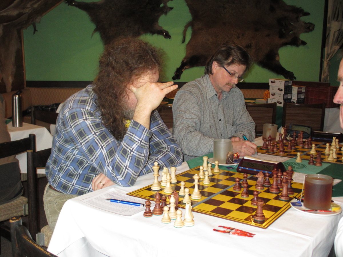 Skóre se mění na čtyřce, Hurťák s Martinem Pečinkou už to nechtějí hrotit. 2:1 Nečekaná rána však přichází na sedmičce, Honza Švub neustál časovou tíseň a dostává prachobyčejnou koňskou vidli. 2:2 a kisny na několika šachovnicích. Přihlížející Vašek Chládek mi přesvědčivě dokazuje, jak je pozice Martina na jedničce méněcenná, já tomu radši ani nerozumím. (Jinak diváků se průběžně vystřídalo hodně, naši fanoušci, naše céčko, třebovské béčko, snad jsem na nikoho nezapomněl … Návštěva jak na Spartě!) Své pozice naopak slibně vylepšují Petr na šestce a Jarda na osmičce.