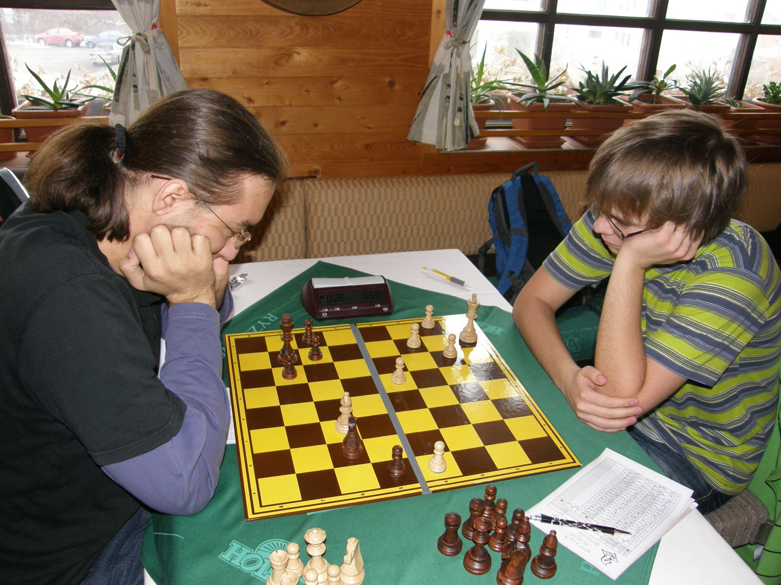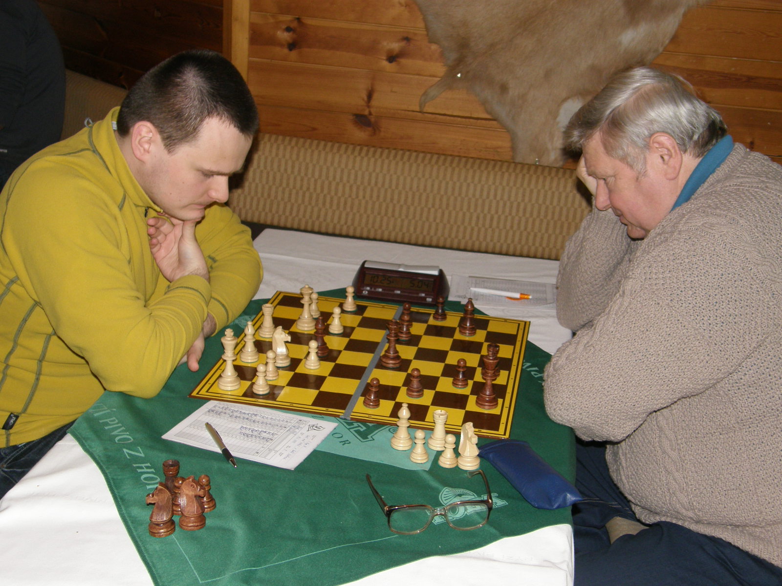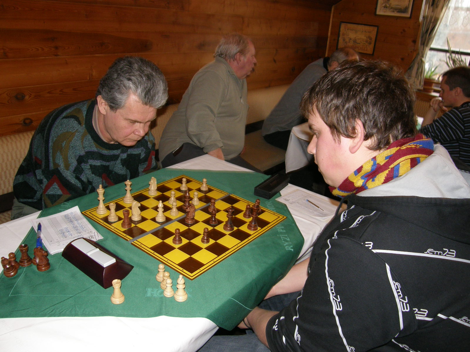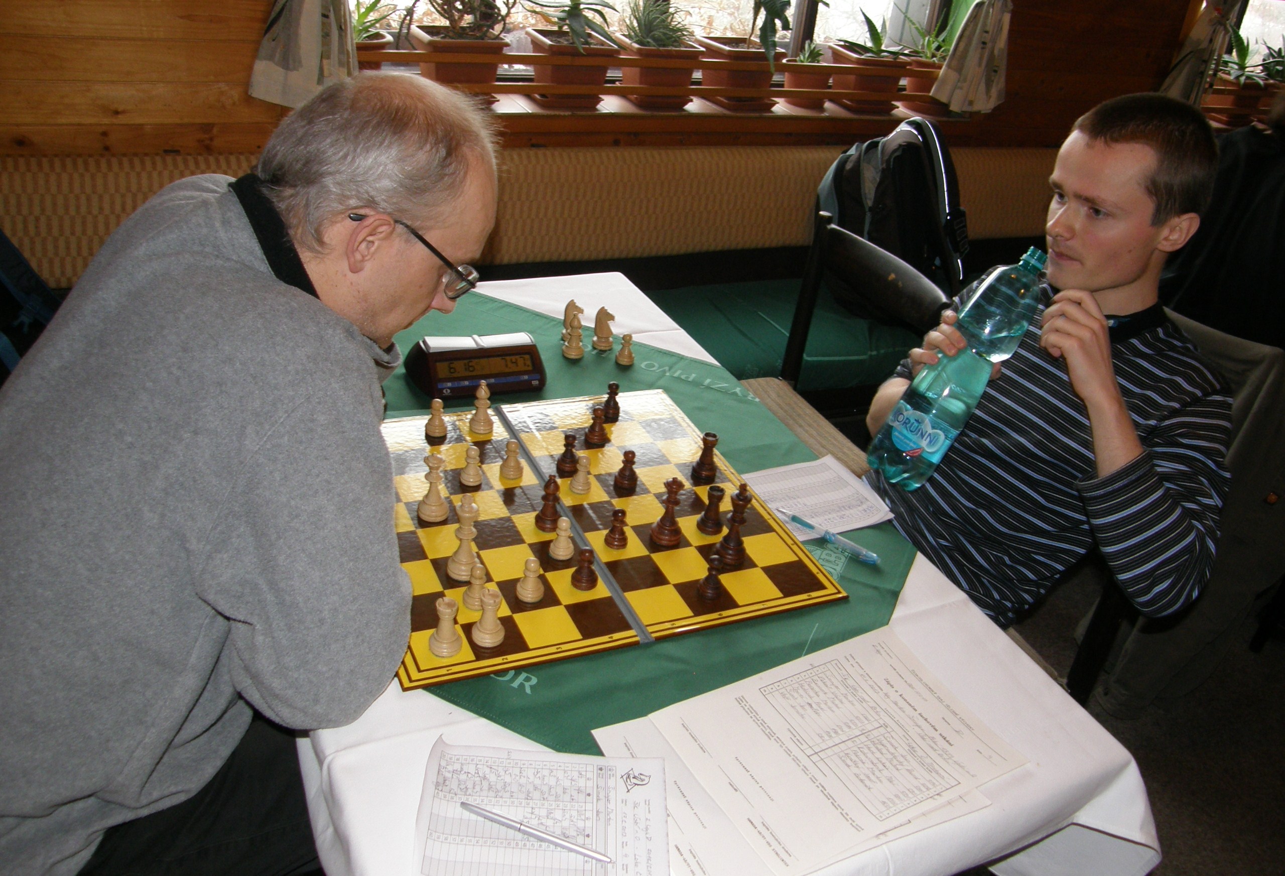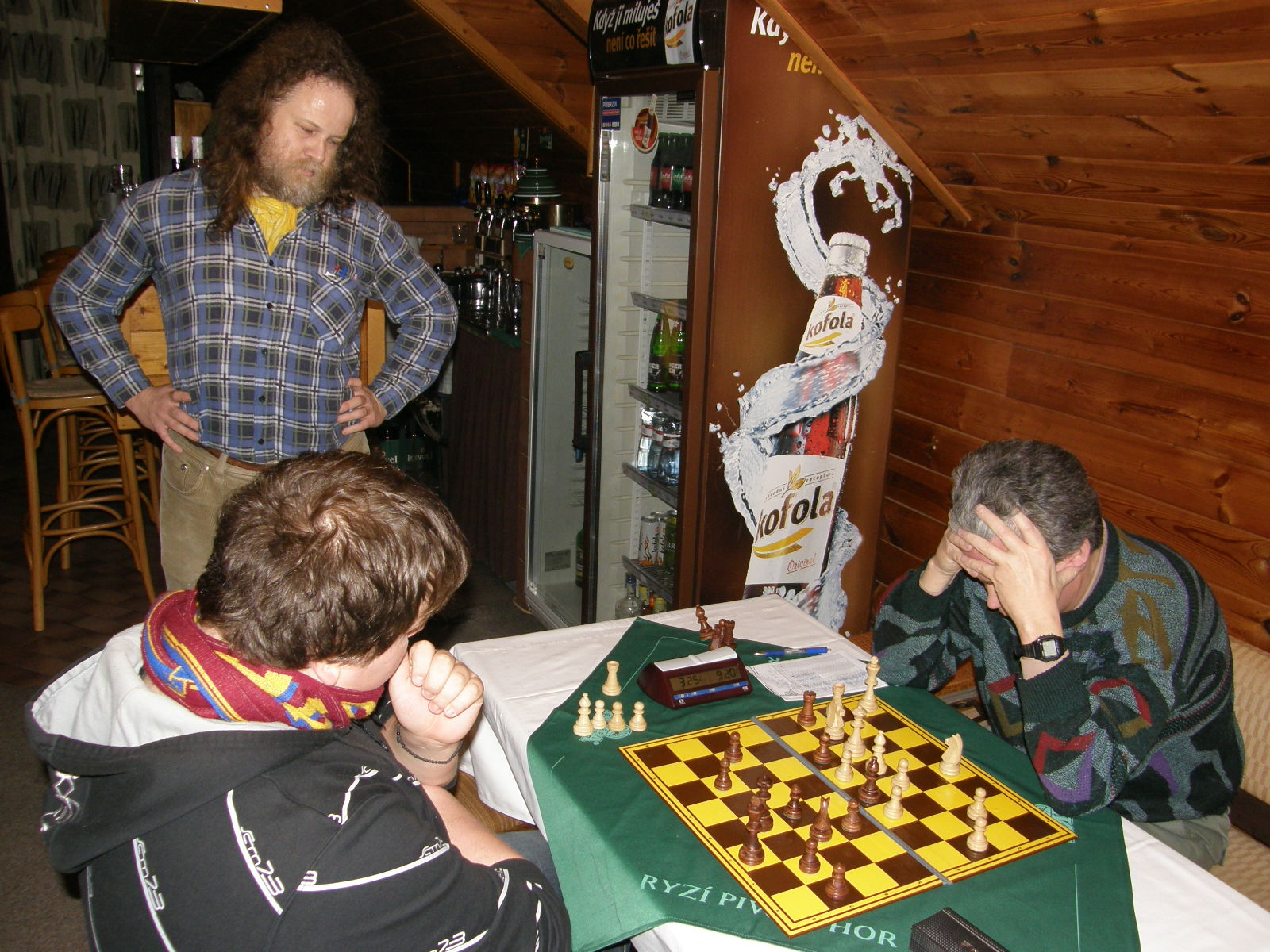 Doplněno pár fotek, jednak od Pokyho a jednak ode mě. Moje pozice mi vyhovovala do doby, než jsem v propočtu zcela přehlédl, že nemůžu brát pěšce na e4 kvůli vyšachování věže, pak už jsem jen mlžil :-).