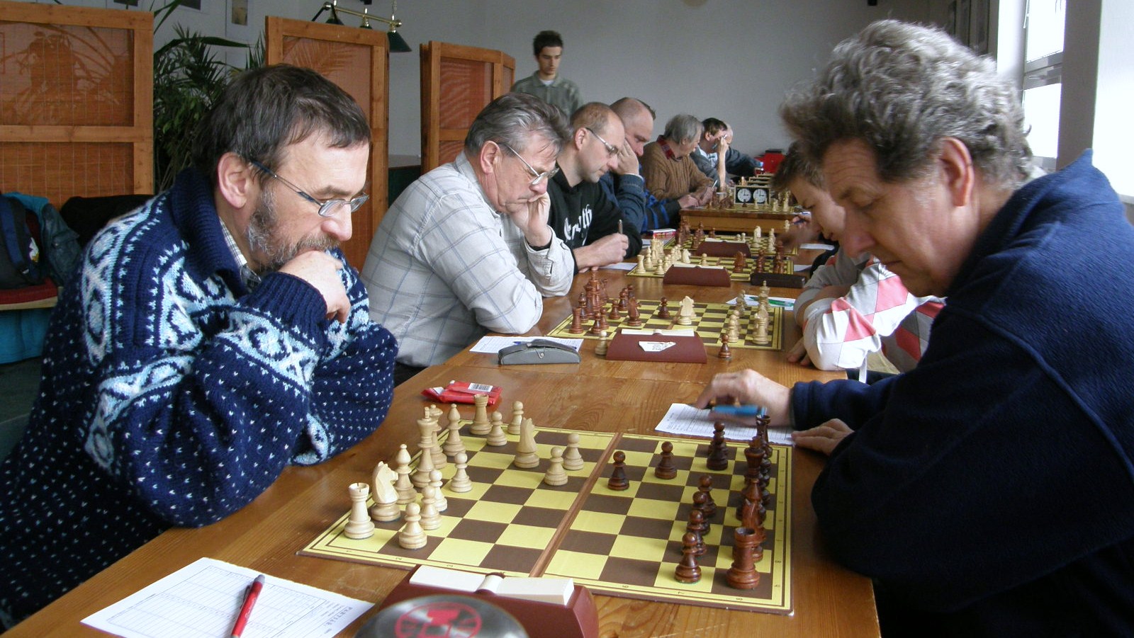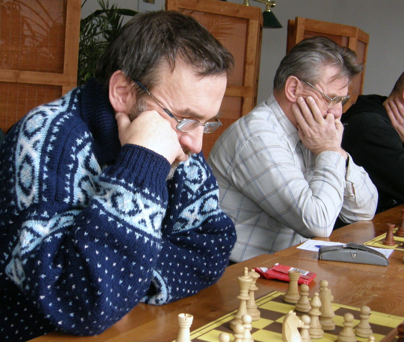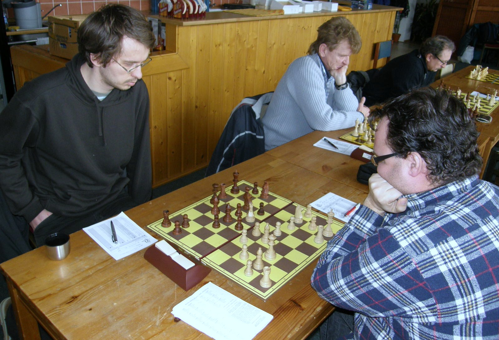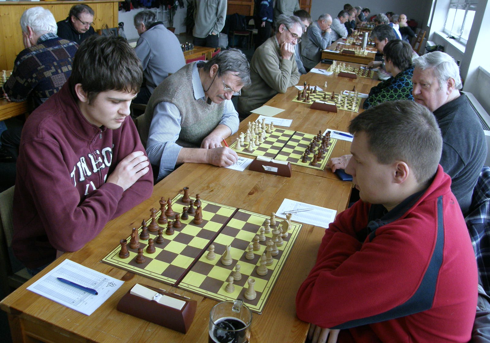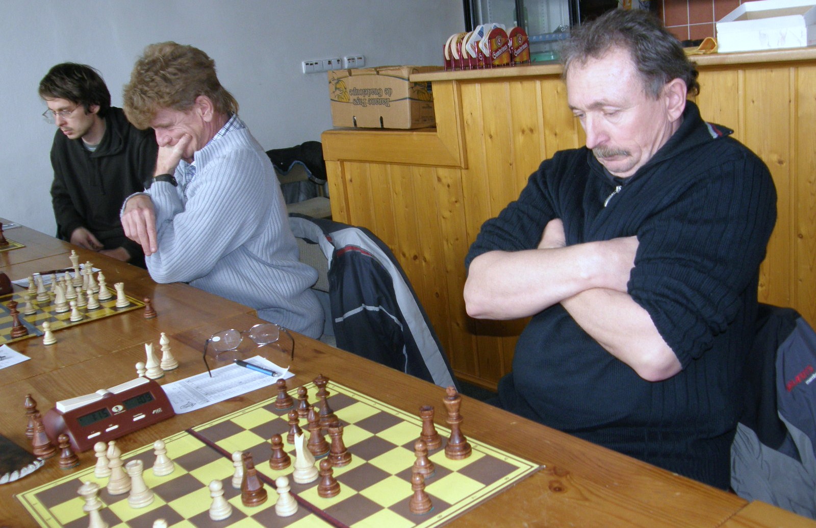 Po dvou naspaných hodinách (ples v Pardubicích) registruji jen letmo sousední KP duel Ústí – Pardubice nevimjaké a a kamarády éčkaře, zápasící se žamberským céčkem, pořizuji pár ilustračních obrázků, nasazuji 1.Jf3 a jdu se prospat 🙂