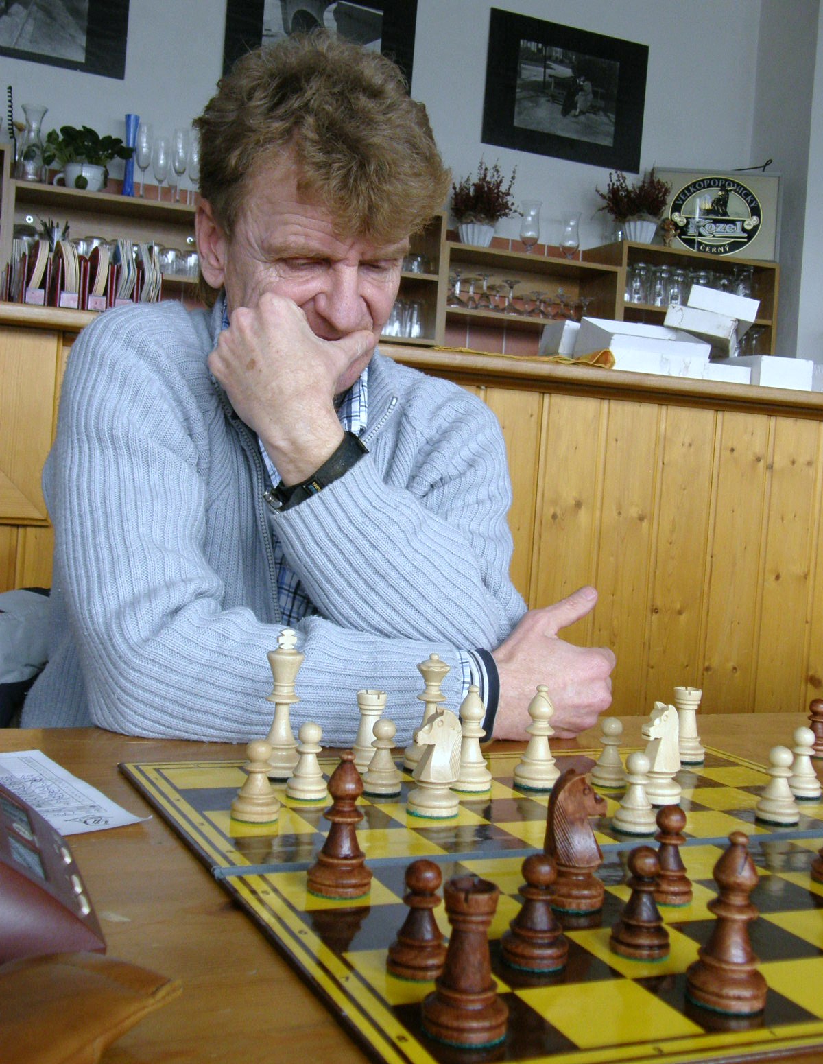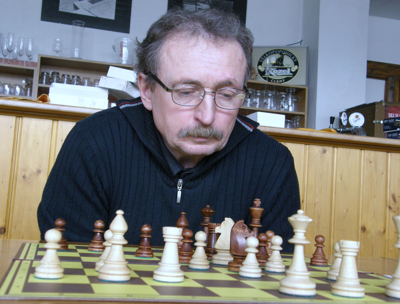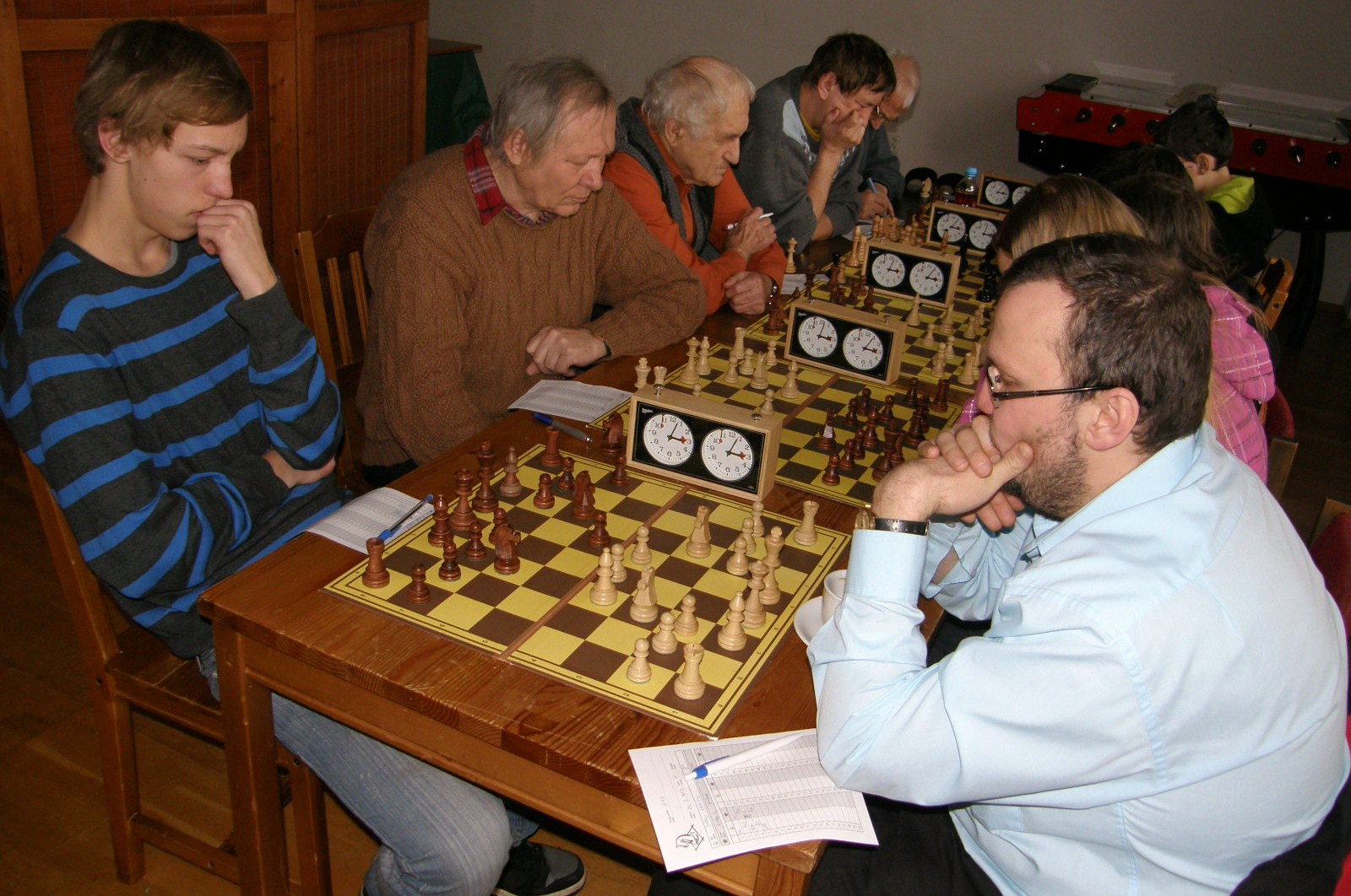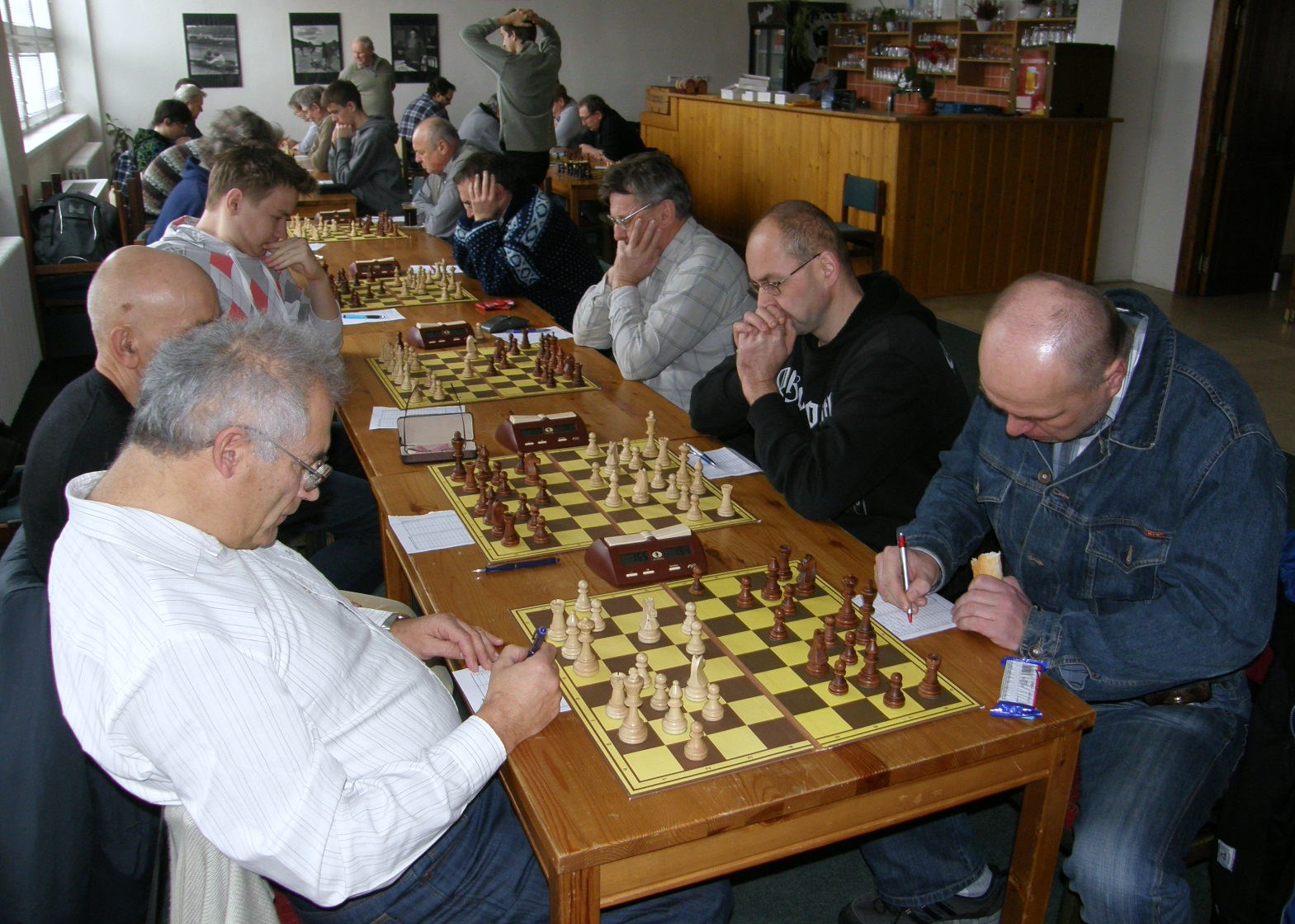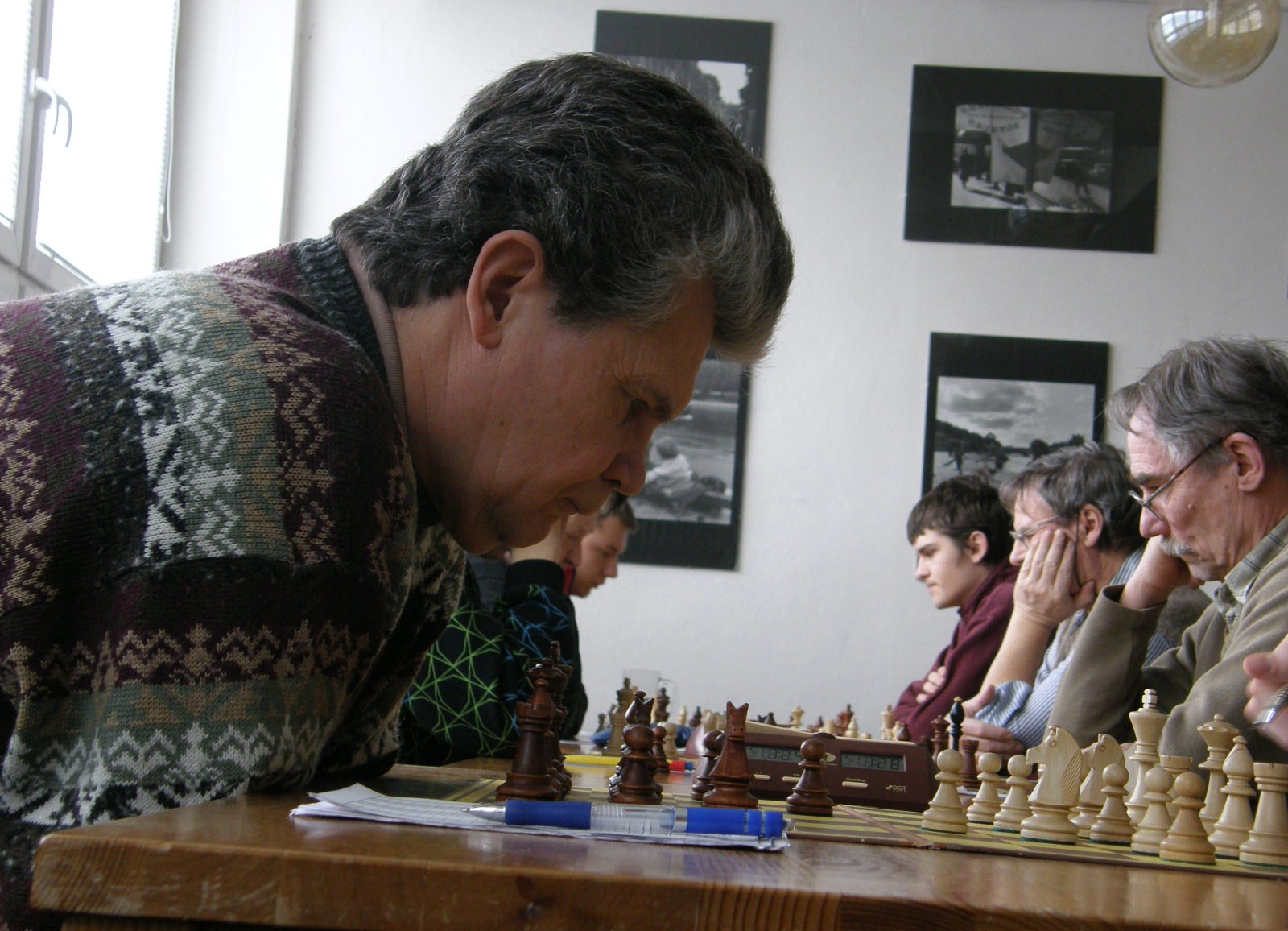 Po dvou naspaných hodinách (ples v Pardubicích) registruji jen letmo sousední KP duel Ústí – Pardubice nevimjaké a a kamarády éčkaře, zápasící se žamberským céčkem, pořizuji pár ilustračních obrázků, nasazuji 1.Jf3 a jdu se prospat 🙂
