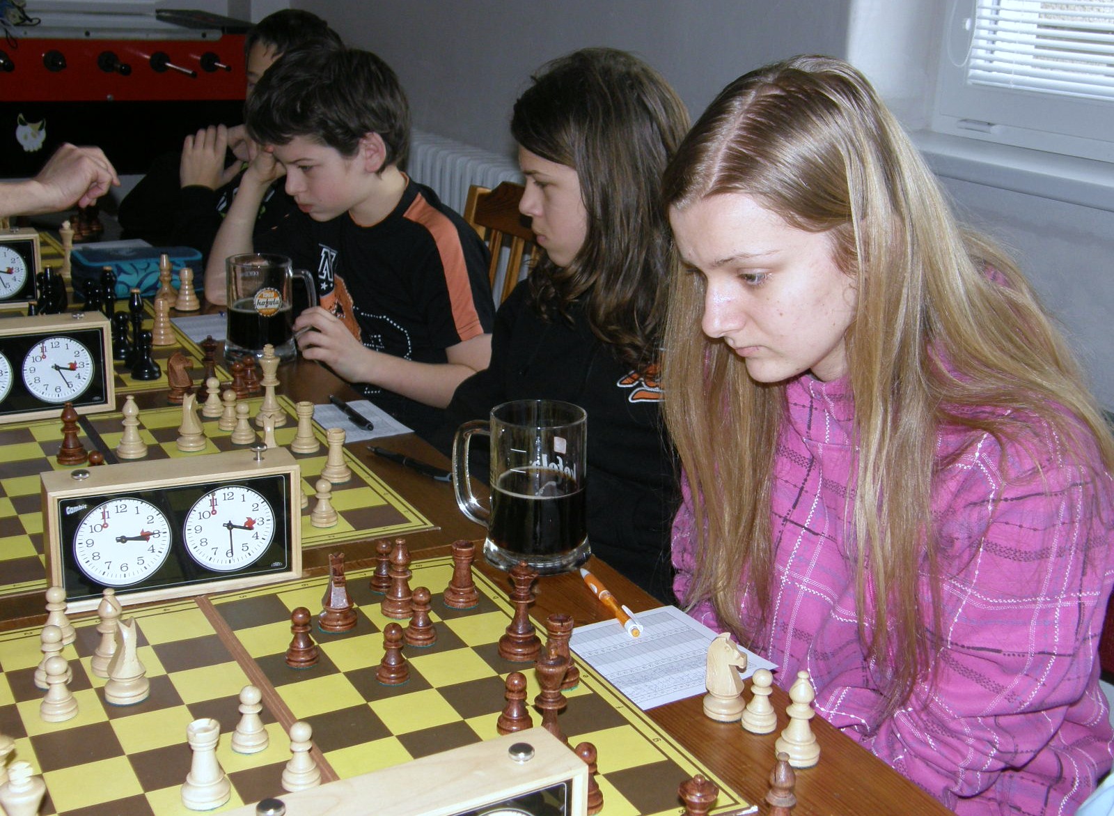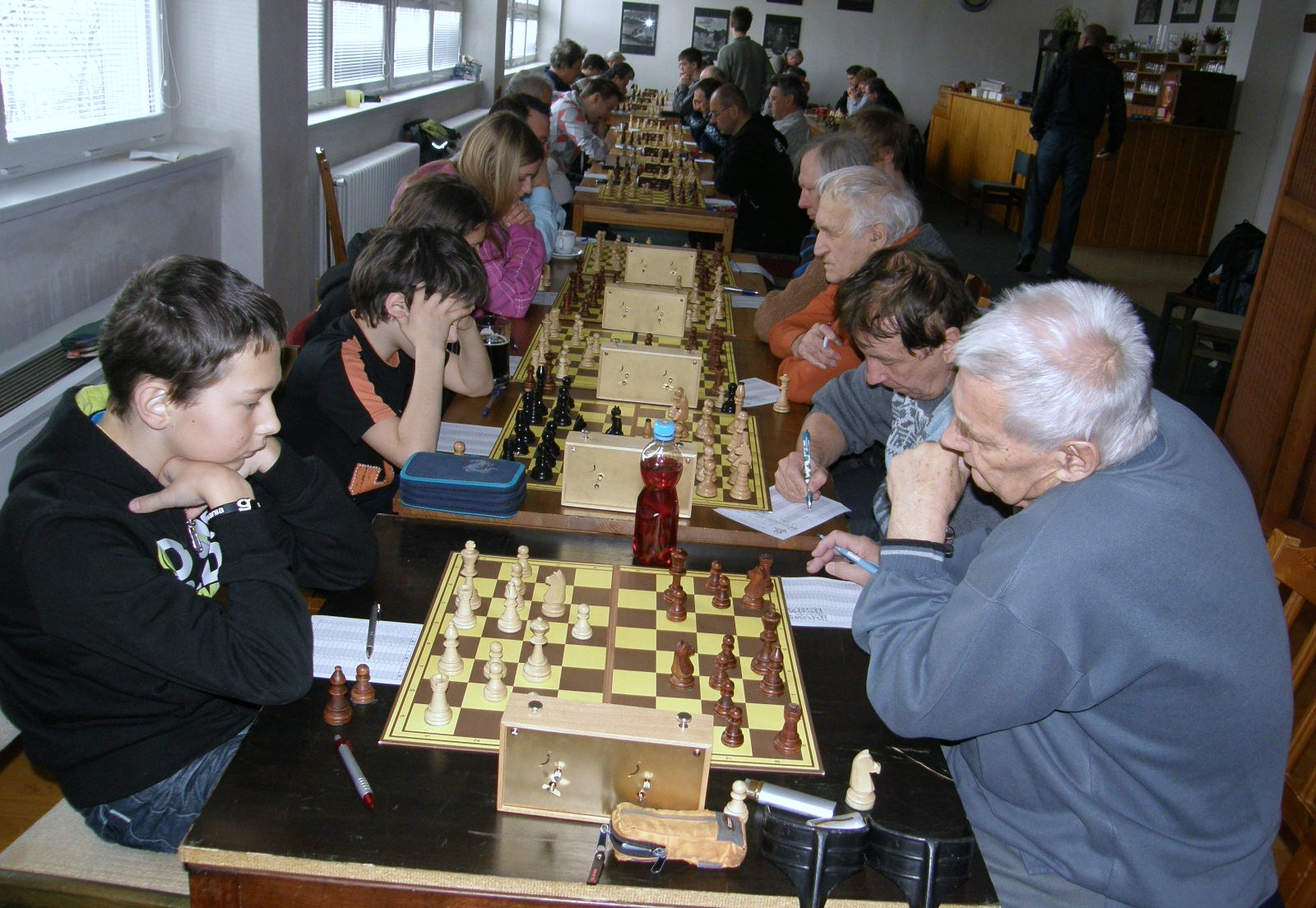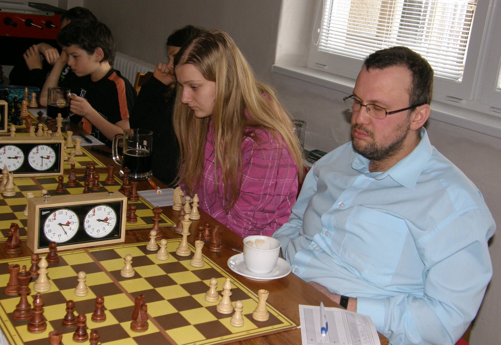Samotný zápas vnímám spíš jedním okem 😀 O dvě soutěže výš dostávají Pardubičtí nemilosrdný 5,5 výprask (reportáž jistě někdo dodá :-), naopak juniorské ééé hraje hodně bídně, vzadu inkasuje od zkušených hostujících mazáků nemilosrdně 3:0 a nemá o co hrát, i když amazonka Káťa Šmajzrová papírově silnějšího soupeře rozkládá na prvočinitele a ani kapitán Martin Dudla nehraje špatně.