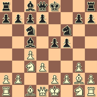 6. Sg5? Typická chyba, která měla být potrestána. Střelec sice míří na černou dámu, sám však zároveň stojí pod jejím působením! 6. … 0-0? Nepotrestal. Typické je 6. … Sxf2+! 7. Kxf2 Jg4+ 8. Ke1 Dxg5, bílý je bez pěšce a bez rošády. 7. Jd5? Je7? Stále šlo 7. … Sxf2+!