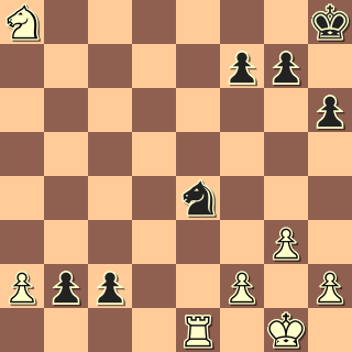 Bílému není co závidět: hrozí jak braní na b2, tak i d3 s útokem na f2. Ani nejlepší 1. Je5 nestačí k udržení partie. Bílý ale dosud nebezpečí neviděl. 1. Je7+ Kh8 2. Jxd5