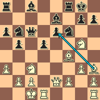 Po 11. … b5! nelze 12. cxb5 Jxe4, přišlo proto 12. Sxf6, čímž bílý s útokem na královském křídle skončil. 12. … Sxf6 13. cxb5 znamená z pohledu černého oběť pěšce za aktivitu. Výhoda mi ale někde protekla mezi prsty a čas chyběl. Bílý se mohl dostat do lepší koncovky, vybral si ale jen V+4p x S+J+2p. Dokonce jsem pak dva pěšce získal, ale pořád to byla remíza: