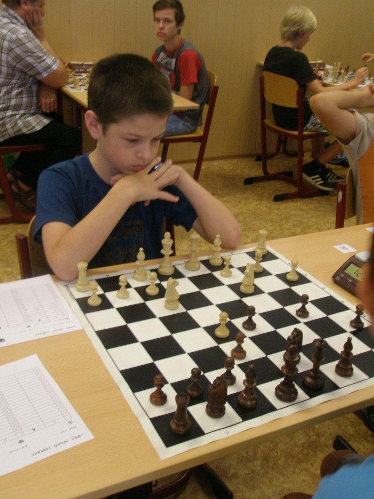 Verunka hrála s domácím panem Švecem (1767), toho známe už z loňska. V sicilce se bílými držela asi deset tahů, pak místo dobrání figury zvolila špatný mezitah, pak odrazila první hrozbu po diagonále a8-h1, druhou už ne. Natka hrála s osmiletým Přibylem (1429), ten tahal velmi energicky, prostorovou převahu v centru proměnil kolem 20. tahu v zisk pěšce a přidal k tomu ještě kvalitu. Ale prohrát s mistrem republiky není ostuda.