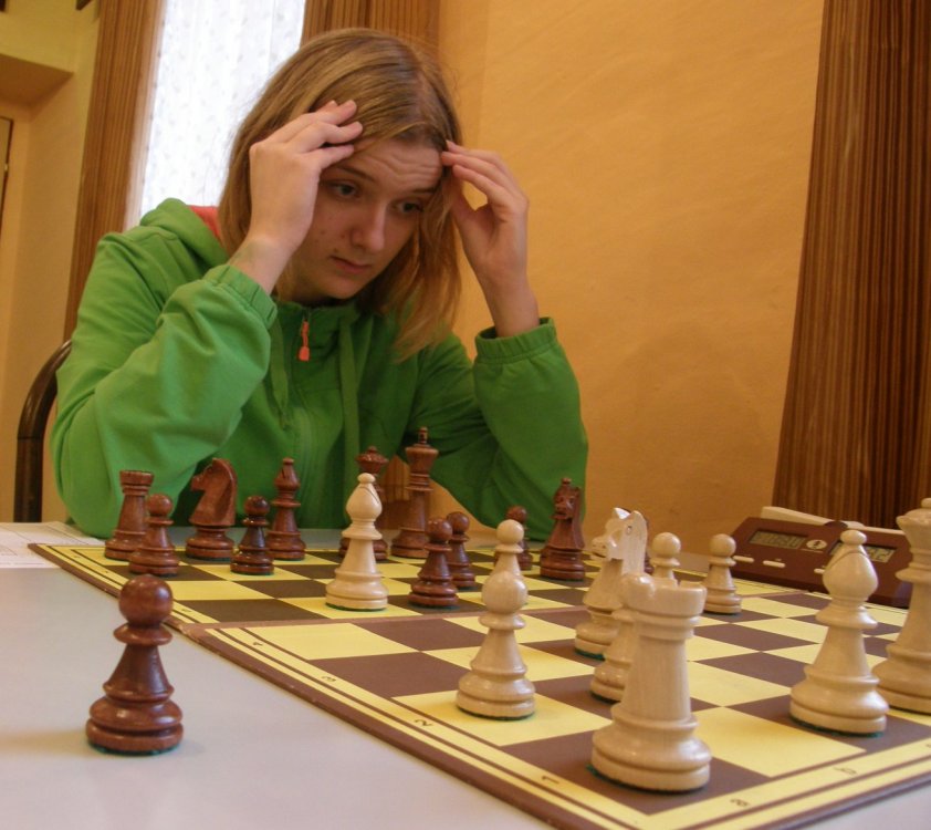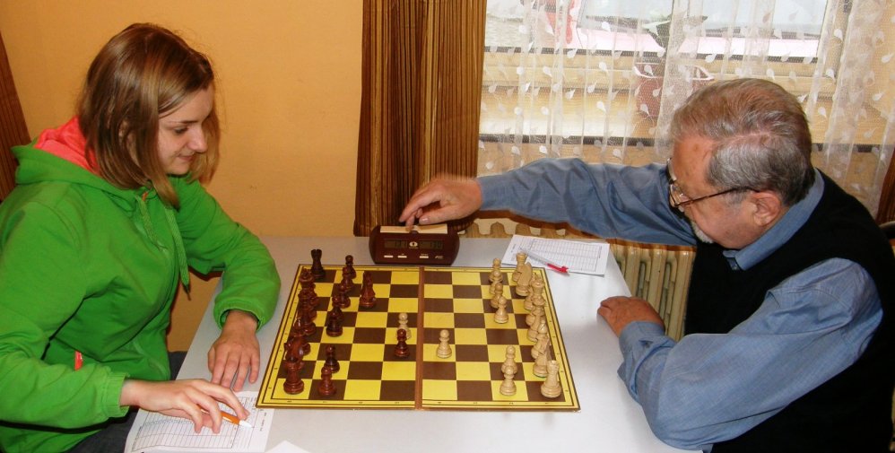 7. Glembek – Šmajzrová: Souboj mládí se zkušeností, na který jsem se těšil asi nejvíc (když už nedošlo na opáčko čtvrtečního oddíláku s prohozenými barvami 🙂 ). Hrálo se na ústecké poměry nečekaně teoretické benoni, jak vidno, táta předseda Martin předává poznatky. Hrála se hlavní varianta s e4, f4, Sb5+, kde bych nějaké teoretické nuance (coby pseudoznalec varianty) asi našel, ale na tom nesejde. Postavila se normální pozice s vyrovnaným časem, Bohouš ohodnotil pozici jako tupou (též bych namítal, ale co na tom), v 17. tahu zahrál Sf2 a nabídl takticky půlku – s ohledem na vývoj zápasu vhodnou. Katka kývla, na ELO si pomohla. ½
