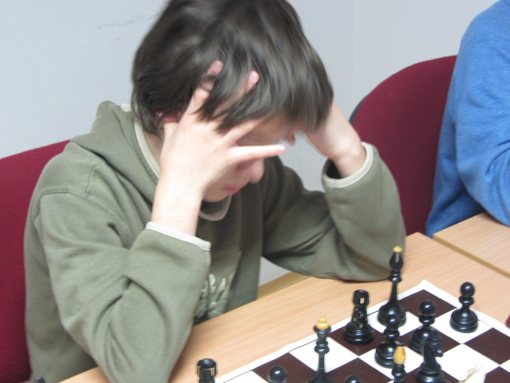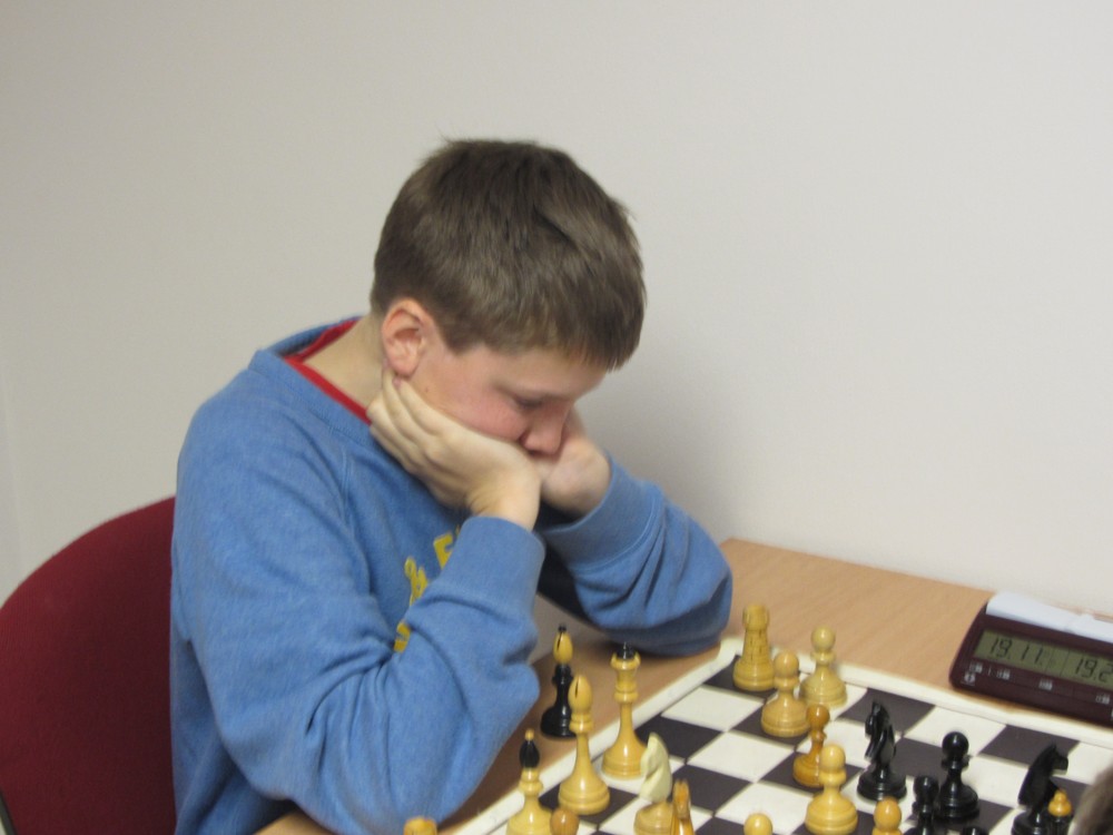 Tak tedy ZŠ Dobrovského. Klid nám dávají dva rychlé body vepředu, Vašek s Vojtou se nemýlí, 2:0. Ještě lepší je, že polabinský Vojtěch Váňa získává proti chrudimskému Karlu Lysému dámu a záhy ho i matí, přestože je o tři roky mladší! O dámu vede i náš Vítek, takže rozhodovat bude Veronika, stojí slušně, ale není to ještě ložené. Radši vkládám naděje do čtvrté desky zápasu Polabiny – Chrudim, kde pardubický Pelcl vede nad Násadou o figuru, fajn … jé, už o ni zase nevede … jé, teď má prohranou věžovku … ale hurá, Násada nechává jednotahově stát věž … leč ouha, Pelcl ji nebere!!! To je na infarkt, naštěstí v našem zápase Verča už vyhrává a já se chystám slavit postup, až mě musí Vašek upozorňovat, že Vítek ještě nedohrál … avšak to už netrvá dlouho, vítězíme 4:0, zatímco Chrudim „jen“ 3:1 a to nám stačí!!!