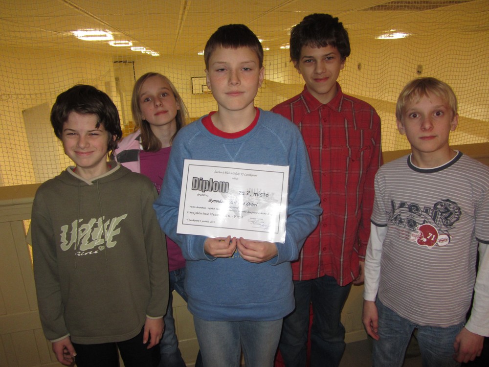 Už vloni jsme v kraji skončili třetí, byť to tehdy bylo spíš překvapení, a letos jsme pomýšleli určitě na medaili a třeba i na postup. Velkým favoritem bylo družstvo gymnázia Lanškroun (Havelka, Doleček, Kupsa, Kolomý A.). Na druhé postupové místo mohly reálně pomýšlet další čtyři týmy. Dva s podobně vyrovnanou sestavou: Hlinsko (Říha, Vašková, Ročňák, Pešek) a my. Další dva naopak vždy se skvělou sourozeneckou dvojicí vepředu a slabší druhou polovinou: Chrudim se sourozenci Půlpánovými a Polabiny s Kubou a Ondrou Cachovými. (Ze silnějších hráčů tu byla ještě Ambrožová za Svitavy a Tulis za Poličku.)