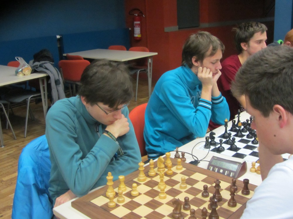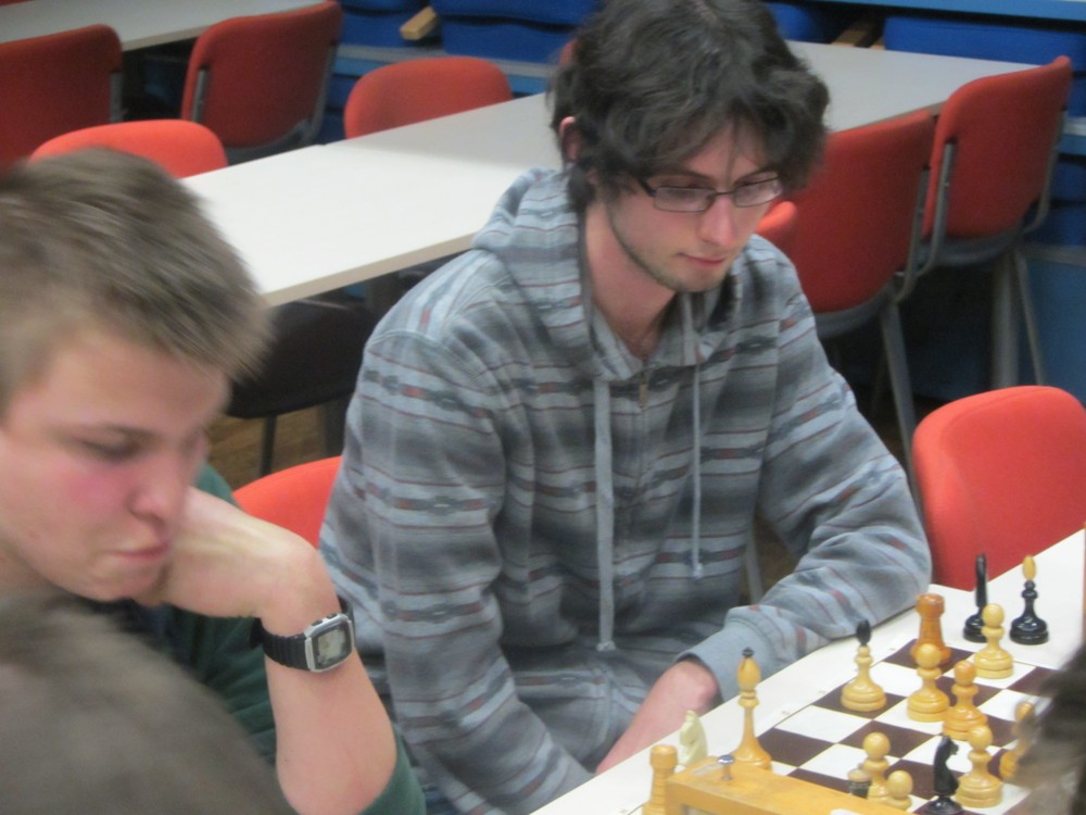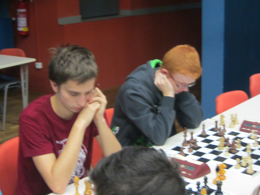 S úvodem turnaje jsem musel řešit ještě jednu dramatickou situaci: při zahájení prvního kola byla na místě jen půlka týmu a nebylo zřejmé, kde hledat zbytek. Jenda s Petrem si totiž skočili za roh něco koupit … a nevraceli se, mobil nebrali … a turnaj už začal, časový limit zkrácen na dvacet minut, hodiny spuštěny … takže když jsem oba zatoulané hráče konečně spatřil, jak se beze spěchu vracejí s nakoupenou svačinou, nebyl jsem, obávám se, příliš příjemný ;-). Jenda na to nakonec trochu doplatil, proti Kozákovi měl sice v koncovce dva pěšce, ale s pouhou minutou je naprosto nemohl uplatňovat.