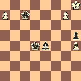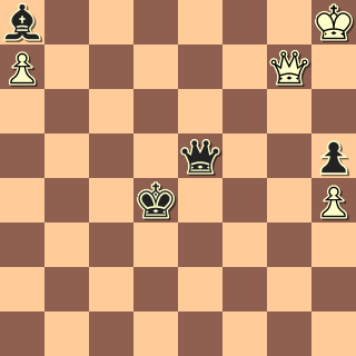 Pozice je přes převahu střelce remízová! Jenže přišlo 4. Dxe5+?? Kxe5 a černý právě včas pokryje ph5 a sám ph4 získá. (Po 4. Kh7 Dxg7+? 5. Kxg7 Ke5 6. Kg6 Sf3 7. a8D by ph5 padl, ani tahy střelcem nebo králem však bílému nic neslibují.) 0:1